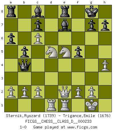 Last move : 1-0 2017 March 8 17:51:44 [Event "FICGS__CHESS__CLASS_D__000233"] [Site "FICGS"] [Date "2017.02.05"] [Round "1"] [White "Sternik,Ryszard"] [Black "Trigance,Emile"] [Result "1-0"] [WhiteElo "1739"] [BlackElo "1676"] 1.e4 e5 2.Nf3 Nc6 3.Bb5 a6 4.Ba4 Nf6 5.O-O Nxe4 6.Re1 Nc5 7.Bxc6 dxc6 8.Nxe5 Be7 9.d4 Ne6 10.Be3 O-O 11.Nc3 f6 12.Nf3 Re8 13.h4 Bd6 14.d5 Nc5 15.Bxc5 Bxc5 16.Qd3 Be7 17.Qc4 Kf8 18.dxc6 b5 19.Qe4 f5 20.Qe2 Qd6 21.Ne5 Kg8 22.Rad1 Qb4 23.Nd5 1-0 Ruy Lopez : Open (Tarrasch) defense Kingside Castling by player White (move 5) Kingside Castling by player Black (move 10) Player White won this chess game. Follow this game move after move (download)It is peculiar but a fact nevertheless, that gamblers in chess always have enthusiastic followers. (Botvinnik) Wenn man heute mit 14 Jahren noch kein GM ist, kann man es vergessen. (Viswanathan Anand) El Ajedrez es un terrible juego. Si no controlas el centro, tu oponente tiene una posición mas holgada. Si tienes control del centro, ¡entonces realmente tu tienes algo de que preocuparte!. (Siegbert Tarrasch) Nous vivons dans un monde échiquéen : chaque jour qui passe est un défi à relever. (Philosophe Sasha) Tomorrow's what you make of it. (Horatio Caine, C.S.I. Miami)