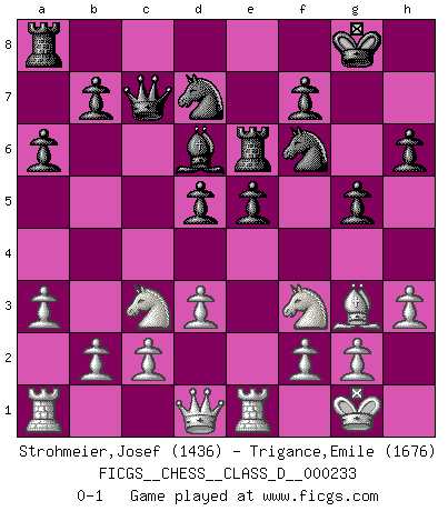 Last move : 0-1 2017 April 5 9:5:17 [Event "FICGS__CHESS__CLASS_D__000233"] [Site "FICGS"] [Date "2017.02.05"] [Round "1"] [White "Strohmeier,Josef"] [Black "Trigance,Emile"] [Result "0-1"] [WhiteElo "1436"] [BlackElo "1676"] 1.e4 e5 2.Bc4 Nf6 3.d3 c6 4.Nf3 d5 5.exd5 cxd5 6.Bb5+ Bd7 7.Bxd7+ Nbxd7 8.O-O Bd6 9.Re1 O-O 10.Bg5 Re8 11.Nc3 h6 12.Bh4 g5 13.Bg3 a6 14.h3 Qc7 15.a3 Re6 0-1 Bishop's Opening : Berlin defense Kingside Castling by player White (move 8) Kingside Castling by player Black (move 9) Player Black won this chess game. Follow this game move after move (download)A good player is always lucky. (Jose Raul Capablanca) Du weisst es gibt ein Problem mit Computern und Fernschach, wenn jeder eine Rating von 2450 hat. (John Christen Knudsen) La pasion por jugar al Ajedrez es una de las mas inexplicables en el mundo. (H.G. Wells) Assurément je connaissais par expérience le mystérieux attrait de ce jeu royal, le seul entre tous les jeux inventés par les hommes qui échappe souverainement à la tyrannie du hasard, le seul où l'on ne doive sa victoire qu'à son intelligence ou plutôt à une certaine forme d'intelligence. Mais n'est-ce pas déjà le limiter injurieusement que d'appeler les échecs un jeu ? N'est-ce pas une science, un art ou quelque chose qui, comme le cercueil de Mahomet entre ciel et terre, est suspendu entre l'un et l'autre, et qui réunit un nombre incroyable de contraires ? [...] C'est une pensée qui ne mène à rien, une mathématique qui n'établit rien, un art qui ne laisse pas d'uvre, une architecture sans matière; et il l'a prouvé néanmoins qu'il était plus durable, à sa manière, que les livres ou que tout autre monument, ce jeu unique qui appartient à tous les peuples et à tous les temps, et dont personne ne sait quel dieu en fit don à la terre pour tuer l'ennui, pour aiguiser l'esprit et stimuler l'âme. Où commence-t-il, où finit-il ? (Stefan Zweig) There will be no order, only chaos. (Sol Robeson in Pi by Darren Aronofsky)