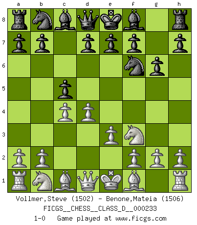 Last move : 1-0 2017 March 18 8:19:42 [Event "FICGS__CHESS__CLASS_D__000233"] [Site "FICGS"] [Date "2017.02.05"] [Round "1"] [White "Vollmer,Steve"] [Black "Benone,Mateia"] [Result "1-0"] [WhiteElo "1502"] [BlackElo "1506"] 1.d4 Nf6 2.c4 c5 3.e3 g6 4.Nf3 1-0 This chess game has been lost on time (started : 2017.02.05 22:45:0) Benoni defense Player White won this chess game. Follow this game move after move (download)Chess demands total concentration. (Bobby Fischer) Heutzutage gewinnt im Turnier nicht derjenige Spieler, der weitreichende Pläne entwirft, sondern einfach jener, der Zug um Zug kämpft. (David Bronstein) Si el ingenio solamente fuese necesario para lucirse, las mujeres serían las mejores jugadoras de Ajedrez del mundo. (Albin) J'ai toujours senti une vague pitié pour l'homme qui ne connaît rien aux échecs, tout comme j'en aurais pour un homme ignorant de l'amour. Les Echecs, comme la musique ou comme l'amour, ont le pouvoir de rendre heureux. (Siegbert Tarrasch) The leaves of memory seemed to make a mournful rustling in the dark. (Henry Wadsworth Longfellow)