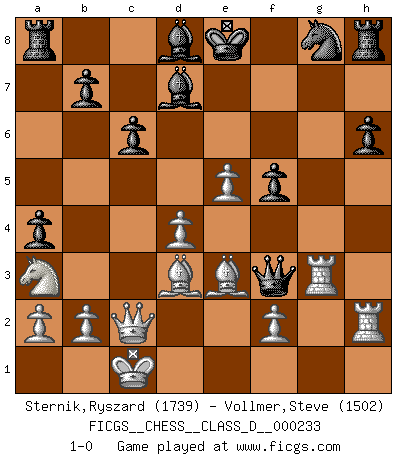 Last move : 1-0 2017 February 25 9:43:23 [Event "FICGS__CHESS__CLASS_D__000233"] [Site "FICGS"] [Date "2017.02.05"] [Round "1"] [White "Sternik,Ryszard"] [Black "Vollmer,Steve"] [Result "1-0"] [WhiteElo "1739"] [BlackElo "1502"] 1.e4 e6 2.Qe2 Bc5 3.Nf3 Nc6 4.c3 d5 5.e5 a5 6.d4 Bb6 7.Qc2 Nce7 8.Bd3 Ng6 9.h4 Nf8 10.h5 h6 11.Be3 Qe7 12.Na3 Bd7 13.c4 c6 14.O-O-O a4 15.Rh4 f5 16.g4 g5 17.hxg6 Nxg6 18.Rh2 Qf7 19.gxf5 exf5 20.Rg1 Bd8 21.cxd5 Qxd5 22.Rxg6 Qxf3 23.Rg3 1-0 French : Chigorin variation Queenside Castling by player White (move 14) Player White won this chess game. Follow this game move after move (download)A good player is always lucky. (Jose Raul Capablanca) Kein Großmeister ist normal. Sie unterscheiden sich nur im Ausmaß Ihrer Verrücktheit. (Viktor Kortschnoi) Un sacrificio se refuta mucho mejor al aceptarlo. (Wilhelm Steinitz) À la honte des hommes, on sait que les lois du jeu sont les seules qui soient partout justes, claires, inviolables et exécutées. Pourquoi l'Indien qui a donné les règles du jeu d'échecs est-il obéi de bon gré dans toute la terre, et que les décrétales des papes, par exemple, sont aujourd'hui un objet d'horreur et de mépris ? C'est que l'inventeur des échecs combina tout avec justesse pour la satisfaction des joueurs, et que les papes, dans leurs décrétales, n'eurent en vue que leur seul avantage. L'Indien voulut exercer également l'esprit des hommes et leur donner du plaisir; les papes ont voulu abrutir l'esprit des hommes. Voltaire (Dictionnaire philosophique / Garnier 1967) If we don't succeed, we run the risk of failure. (George W. Bush)