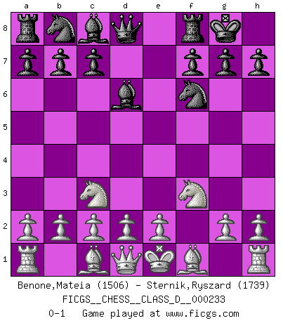 Last move : 0-1 2017 March 19 8:23:13 [Event "FICGS__CHESS__CLASS_D__000233"] [Site "FICGS"] [Date "2017.02.05"] [Round "1"] [White "Benone,Mateia"] [Black "Sternik,Ryszard"] [Result "0-1"] [WhiteElo "1506"] [BlackElo "1739"] 1.f4 e5 2.fxe5 d6 3.exd6 Bxd6 4.Nf3 Nf6 5.Nc3 O-O 0-1 This chess game has been lost on time (started : 2017.02.05 22:45:0) Bird : From gambit Kingside Castling by player Black (move 5) Player Black won this chess game. Follow this game move after move (download)Why must I lose to this idiot ? (Aron Nimzovich) Versuche, dich von der Sklaverei der Eröffnungsvarianten zu befreien. Stattdessen soll man gewisse Typenpositionen erlernen, die man eingehend analysiert. (Aaron Nimzowitsch) El Ajedrez se juega con la mente... ¡no con las manos!. (Renaud y Kahn) Si le désir cupide (et stupide) de gagner est une inépuisable source de souffrance, une combinaison brillante sur l'échiquier est une découverte : le coquelicot qui s'épanouit lorsque apparaît la Voie Lactée. (Arrabal) Big Chess is a place for big hallucinations. (Thibault de Vassal)