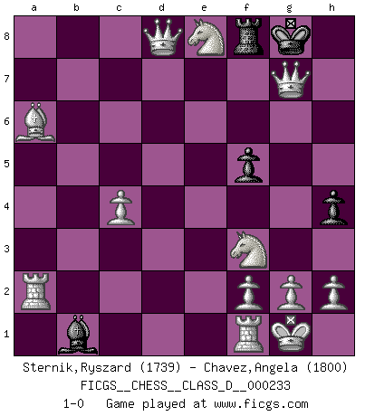 Last move : 1-0 2017 April 3 10:19:52 [Event "FICGS__CHESS__CLASS_D__000233"] [Site "FICGS"] [Date "2017.02.05"] [Round "1"] [White "Sternik,Ryszard"] [Black "Chavez,Angela"] [Result "1-0"] [WhiteElo "1739"] [BlackElo "1800"] 1.e4 e5 2.Nf3 Bd6 3.Bc4 Nf6 4.O-O O-O 5.Nc3 Nc6 6.d3 Bc5 7.Bg5 d5 8.exd5 Nb4 9.a3 a5 10.axb4 e4 11.Bxf6 Qxf6 12.Nxe4 Qxb2 13.bxc5 b6 14.Ra2 Qb4 15.c3 Qxc3 16.Nxc3 bxc5 17.Nb5 Bf5 18.Nxc7 Ra7 19.d6 Ra6 20.Bxa6 c4 21.dxc4 a4 22.Qxa4 h5 23.Ne8 Bd3 24.d7 f5 25.d8Q Bb1 26.Qa4d7 h4 27.Qxg7+ 1-0 King's knight Opening Kingside Castling by player White (move 4) Kingside Castling by player Black (move 4) Promotion Queen by player White (move 25) Player White won this chess game. Follow this game move after move (download)I look one move ahead... the best ! (Siegbert Tarrasch) Das Spiel gibt uns die Genugtuung, die das Leben uns versagt. (Emanuel Lasker) Por la belleza de sus partidas, la claridad de su juego y lo brillante de sus ideas, Fischer se creó el mismo como un artista de la misma estatura como Brahms, Rembrandt y Shakespeare. (David Levy) Roi des jeux et jeu des rois, les échecs portent en eux un sentiment d'infini. Ils donnent à celui qui s'est efforcé d'en approfondir les arcanes l'impression de n'être pas à la mesure de l'homme; en fait, ils constituent un résumé de l'univers, un microcosme, et figurent cette grande échelle qui, dans les plans de la lumière descend jusqu'à la matière, qui des abîmes insondables remonte jusqu'en l'infini de Dieu. (Pyrame) It's not the will to win, but the will to prepare to win that makes the difference. (Bear Bryant)