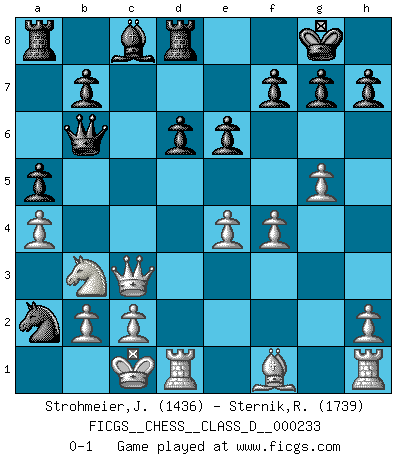 Last move : 0-1 2017 March 18 23:49:53 [Event "FICGS__CHESS__CLASS_D__000233"] [Site "FICGS"] [Date "2017.02.05"] [Round "1"] [White "Strohmeier,Josef"] [Black "Sternik,Ryszard"] [Result "0-1"] [WhiteElo "1436"] [BlackElo "1739"] 1.e4 c5 2.Nf3 Nc6 3.d4 cxd4 4.Nxd4 Nf6 5.Nc3 d6 6.Bg5 e6 7.f4 Qb6 8.Nb3 Be7 9.Qf3 O-O 10.O-O-O a5 11.a4 Rd8 12.g4 Nb4 13.Bxf6 Bxf6 14.g5 Bxc3 15.Qxc3 Na2+ 0-1 Sicilian defense Kingside Castling by player Black (move 9) Queenside Castling by player White (move 10) Player Black won this chess game. Follow this game move after move (download)What would Chess be without silly mistakes ? (Kurt Richter) Die jungen Leute sollen verstehen, dass sie noch etwas von mir lernen können und müssen. (Viktor Kortschnoi) Mis oponentes también hacen buenas movidas. A veces yo no tomo esas cosas en consideración. (Bobby Fischer) Le jeu d'échecs est comme rejeté hors du temps. (Antoine de Saint-Exupéry) Life is pain my dear and anyone who says otherwise is selling something. (Princess Bride)