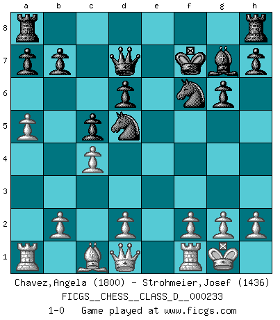 Last move : 1-0 2017 April 5 9:7:17 [Event "FICGS__CHESS__CLASS_D__000233"] [Site "FICGS"] [Date "2017.02.05"] [Round "1"] [White "Chavez,Angela"] [Black "Strohmeier,Josef"] [Result "1-0"] [WhiteElo "1800"] [BlackElo "1436"] 1.e4 c5 2.Bd3 Nc6 3.Nf3 d6 4.O-O g6 5.Nc3 Bg7 6.Nd5 e6 7.a4 exd5 8.exd5 Nce7 9.Ng5 Nf6 10.Bb5+ Bd7 11.Bxd7+ Qxd7 12.Nxf7 Kxf7 13.a5 Nexd5 14.c4 1-0 Sicilian defense Kingside Castling by player White (move 4) Player White won this chess game. Follow this game move after move (download)Chess is no whit inferior to the violin, and we have a large number of professional violinists. (Mikhail Botvinnik) Im Schach nämlich geht es darum, daß Ich des Gegners klein zu kriegen, sein Ego zu zerbrechen und zu zermahlen, seine Selbstachtung zu zertreten und zu verscharren und seine ganze mißachtenswerte sogenannte Persönlichkeit ein für alle Mal tot zu hacken und zu zerstampfen und dadurch die menschliche Gesellschaft von einer stinkenden Pestbeule zu befreien. Es ist ein königliches Spiel. (Robert James Fischer) El Ajedrez no es como la vida... ¡tiene reglas!. (Mark Pasternak) Mais n'est-ce pas déjà le limiter injurieusement que d'appeler les échecs un jeu? N'est-ce pas aussi une science, un art, ou quelque chose qui, comme le cercueil de Mahomet entre ciel et terre, est suspendu entre l'un et l'autre, et qui réunit un nombre incroyable de contraires ? (Stefan Zweig) But they are useless. They can only give you answers. (Pablo Picasso, about computers)