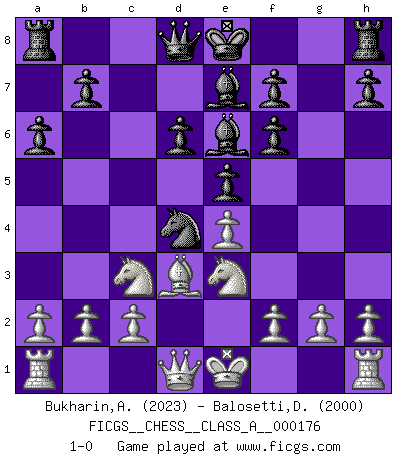 Last move : 1-0 2017 June 8 20:15:38 [Event "FICGS__CHESS__CLASS_A__000176"] [Site "FICGS"] [Date "2017.02.08"] [Round "1"] [White "Bukharin,Alexey"] [Black "Balosetti,Davide"] [Result "1-0"] [WhiteElo "2023"] [BlackElo "2000"] 1.e4 c5 2.Nf3 Nc6 3.d4 cxd4 4.Nxd4 e5 5.Nb5 d6 6.N1c3 a6 7.Na3 Nf6 8.Nc4 Be6 9.Bg5 Be7 10.Bxf6 gxf6 11.Ne3 Nd4 12.Bd3 1-0 Sicilian : Labourdonnais-Loewenthal (Kalashnikov) variation Player White won this chess game. Follow this game move after move (download)The blunders are all there on the board, waiting to be made. (Savielly Tartakover) Schach ist die gewalttätigste aller Sportarten. (Garry Kasparov) Dejen al perfeccionista jugar por correo. (Yasser Seirawan) Les Echecs représentent une sphère d'idées créatrices basée sur la volonté des deux protagonistes. (Smyslov) No man has ever achieved immortality in his own life time. (Unknown)