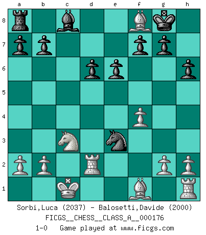 Last move : 1-0 2017 May 30 19:26:15 [Event "FICGS__CHESS__CLASS_A__000176"] [Site "FICGS"] [Date "2017.02.08"] [Round "1"] [White "Sorbi,Luca"] [Black "Balosetti,Davide"] [Result "1-0"] [WhiteElo "2037"] [BlackElo "2000"] 1.e4 c5 2.Nf3 Nc6 3.d4 cxd4 4.Nxd4 d6 5.Nc3 Nf6 6.Bg5 e6 7.Qd2 Be7 8.O-O-O O-O 9.f4 h6 10.Bh4 Nxe4 11.Bxe7 Nxd2 12.Bxd8 Nxd4 13.Rxd2 Nxc2 14.Be7 Ne3 15.Bxf8 1-0 Sicilian defense Queenside Castling by player White (move 8) Kingside Castling by player Black (move 8) Player White won this chess game. Follow this game move after move (download)In order to improve your game, you must study the endgame before everything else, for whereas the endings can be studied and mastered by themselves, the middle game and the opening must be studied in relation to the endgame. (Jose Raul Capablanca) Ich kämpfe solange mein Gegner einen Fehler machen kann. (Emanuel Lasker) Solo existe una cosa que Fischer hace en el Ajedrez sin placer: ¡perder!. (Boris Spassky) Des combinaisons [dans le jeu d'échecs] pareilles à des mélodies. Je crois entendre pour ainsi dire la musique des coups... (Vladimir Nabokov) Industry executives and analysts often mistakenly talk about strategy as if it were some kind of chess match. But in chess, you have just two opponents, each with identical resources, and with luck playing a minimal role. The real world is much more like a poker game, with multiple players trying to make the best of whatever hand fortune has dealt them. In our industry, Bill Gates owns the table until someone proves otherwise. (David Moschella, 'Computerworld')