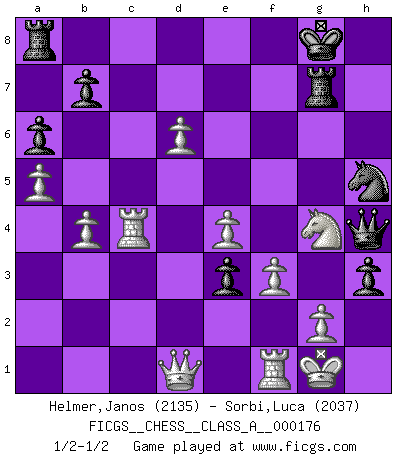 Last move : 1/2-1/2 2017 November 12 13:41:15 [Event "FICGS__CHESS__CLASS_A__000176"] [Site "FICGS"] [Date "2017.02.08"] [Round "1"] [White "Helmer,Janos"] [Black "Sorbi,Luca"] [Result "1/2-1/2"] [WhiteElo "2135"] [BlackElo "2037"] 1.Nf3 Nf6 2.c4 g6 3.Nc3 Bg7 4.d4 O-O 5.e4 d6 6.Be2 e5 7.O-O Nc6 8.d5 Ne7 9.Ne1 Nd7 10.Be3 f5 11.f3 f4 12.Bf2 g5 13.Nd3 Ng6 14.c5 Nf6 15.Rc1 Rf7 16.a4 Bf8 17.a5 h5 18.cxd6 cxd6 19.Nb5 g4 20.b4 g3 21.hxg3 fxg3 22.Bxg3 a6 23.Na3 h4 24.Bh2 Bh6 25.Nc4 Rg7 26.Rc3 Bd7 27.Nxd6 Be3+ 28.Nf2 Nf4 29.Bxf4 exf4 30.Nc4 Nh5 31.d6 Be6 32.Nxe3 fxe3 33.Ng4 h3 34.Bc4 Bxc4 35.Rxc4 Qh4 1/2-1/2 Reti Opening Kingside Castling by player Black (move 4) Kingside Castling by player White (move 7) This chess game ended in a draw. Follow this game move after move (download)The essence of Chess is thinking about what Chess is. (David Bronstein) Herr Iljumschinow ist ein etwas merkwürdiger Geschäftsmann: Er arbeitet zusammen mit Leuten wie Muammar al-Gaddafi; früher ist das Saddam Hussein gewesen. (Joel Lautier) Entre mas años cumplo, mas valoro los Peones. (Keres) Aidez vos pièces, elles vous aideront. (Paul Morphy) If you are going through hell, keep going. (Winston Churchill)