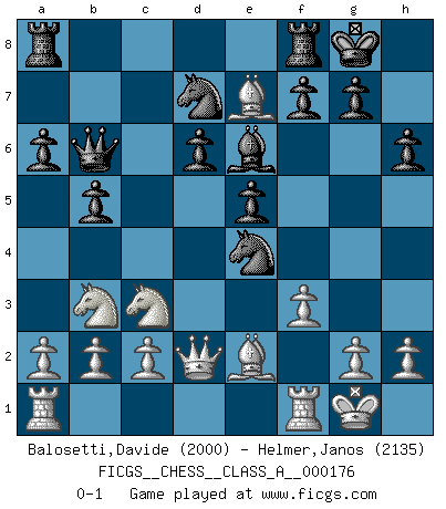 Last move : 0-1 2017 March 14 18:8:46 [Event "FICGS__CHESS__CLASS_A__000176"] [Site "FICGS"] [Date "2017.02.08"] [Round "1"] [White "Balosetti,Davide"] [Black "Helmer,Janos"] [Result "0-1"] [WhiteElo "2000"] [BlackElo "2135"] 1.e4 c5 2.Nf3 d6 3.d4 cxd4 4.Nxd4 Nf6 5.f3 e5 6.Nb3 Be6 7.Nc3 Be7 8.Bg5 Nbd7 9.Bb5 O-O 10.O-O h6 11.Bh4 a6 12.Be2 b5 13.Qd2 Nxe4 14.Bxe7 Qb6+ 0-1 Sicilian : Prins (Moscow) variation Kingside Castling by player Black (move 9) Kingside Castling by player White (move 10) Player Black won this chess game. Follow this game move after move (download)You know, comrade Pachman, I don't enjoy being a Minister, I would rather play Chess like you. (Che Guevara) Es tut gut, die Entwicklungsperiode von, [...] demokratischem Geist durchdringen zu lassen. Wie undemokratisch wäre es doch beispielsweise, den einen Offizier große Spaziertouren vornehmen zu lassen, während die anderen zu Hause säßen und sich entsetzlich langweilten. (Aaron Nimzowitsch) Las combinaciones han sido siempre el aspecto más intrigante del Ajedrez. Los Maestros las buscan, el público las aplauden, los críticos las alaban. La razón se debe a que las combinaciones hacen posible que el Ajedrez sea más que un ejercicio matemático con una carencia de vida. Ellas son la poesía del juego, son del Ajedrez lo que la melodía es de la música. Ellas representan el triunfo de la mente sobre la materia. (Reuben Fine) Il s'avisa de me proposer d'apprendre les échecs qu'il jouait un peu... me voilà forcené des échecs. J'achète un échiquier, je m'enferme dans ma chambre, j'y passe des jours et des nuits à vouloir apprendre par cur toutes les parties. (Jean-Jacques Rousseau, Confessions) May I never be complete. May I never be content. May I never be perfect. Deliver me, Tyler, from being perfect and complete. (Chuck Palahniuk, Fight Club)