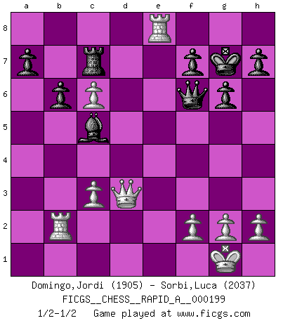 Last move : 1/2-1/2 2017 April 22 3:36:39 [Event "FICGS__CHESS__RAPID_A__000199"] [Site "FICGS"] [Date "2017.02.11"] [Round "1"] [White "Domingo,Jordi"] [Black "Sorbi,Luca"] [Result "1/2-1/2"] [WhiteElo "1905"] [BlackElo "2037"] 1.e4 e5 2.Nf3 Nf6 3.Nxe5 d6 4.Nf3 Nxe4 5.d4 d5 6.Bd3 Nc6 7.O-O Be7 8.c4 Nb4 9.Be2 O-O 10.a3 Nc6 11.cxd5 Qxd5 12.Nc3 Nxc3 13.bxc3 Bf5 14.Re1 Rfe8 15.Bf4 Rac8 16.Bd3 Qd7 17.Rb1 b6 18.d5 Bxd3 19.Qxd3 Bxa3 20.Ng5 g6 21.Ne4 Qf5 22.Bxc7 Rxc7 23.Nf6+ Qxf6 24.Rxe8+ Kg7 25.dxc6 Bc5 26.Rb2 1/2-1/2 Petrov : Classical attack Kingside Castling by player White (move 7) Kingside Castling by player Black (move 9) This chess game ended in a draw. Follow this game move after move (download)Bobby Fischer is the greatest Chess player who has ever lived. (Ken Smith) Ich würde mich als ganz normalen Jungen bezeichnen [Im Alter von 12]. (Sergej Karjakin) Cuando tengas duda... ¡juega al Ajedrez!. (Tevis) Les Cavaliers se révèlent fort utiles dans les positions fermées. D'habitude, les Fous sont un peu plus forts que les Cavaliers dans les positions ouvertes. Qu'on le veuille ou non, il restera toujours des exceptions ! The only thing that overcomes hard luck is hard work. (Harry Golden)