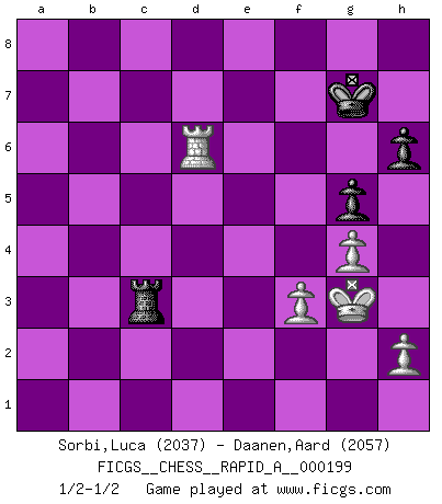 Last move : 1/2-1/2 2017 April 27 14:31:44 [Event "FICGS__CHESS__RAPID_A__000199"] [Site "FICGS"] [Date "2017.02.11"] [Round "1"] [White "Sorbi,Luca"] [Black "Daanen,Aard"] [Result "1/2-1/2"] [WhiteElo "2037"] [BlackElo "2057"] 1.e4 e5 2.Nf3 Nc6 3.Bb5 f5 4.Nc3 fxe4 5.Nxe4 Nf6 6.Nxf6+ Qxf6 7.Qe2 Be7 8.Bxc6 bxc6 9.Nxe5 Qe6 10.d4 O-O 11.Nd3 Qxe2+ 12.Kxe2 d6 13.Be3 a5 14.a4 Bf5 15.Kd2 Bf6 16.Rhe1 Rab8 17.Rab1 Kf7 18.Rh1 h6 19.b3 Rfd8 20.Rhg1 c5 21.dxc5 dxc5 22.Bxc5 Rd5 23.Be3 g5 24.g4 Be4 25.Ke2 Re8 26.Rg3 Rd6 27.Rc1 Rc6 28.Kf1 Bc3 29.Rd1 Kg8 30.Bc1 Bb4 31.Nxb4 axb4 32.Re3 Rxc2 33.Bd2 c5 34.Rde1 Rxd2 35.Rxe4 Rxe4 36.Rxe4 Rb2 37.Re3 Kf7 38.Kg2 Rc2 39.Kf3 c4 40.bxc4 Rxc4 41.Re4 Rc3+ 42.Kg2 Rb3 43.f3 Kf6 44.Kf2 Kf7 45.Ke2 Kf6 46.Kf2 Kf7 47.a5 Ra3 48.Re5 b3 49.Rb5 b2 50.Rxb2 Rxa5 51.Rb6 Kg7 52.Kg3 Ra3 53.Rd6 Rb3 54.Re6 Ra3 55.Rb6 Rc3 56.Ra6 Rb3 57.Rd6 Ra3 58.Rb6 Rc3 59.Rd6 1/2-1/2 Ruy Lopez : Schliemann defense, Berger variation Kingside Castling by player Black (move 10) 10 pieces endgame at move 50 : White KRPPPP , Black KRPP WHITE : King + 1 Rook 4 Pawns BLACK : King + 1 Rook 2 Pawns 9 pieces endgame at move 50 : White KRPPP , Black KRPP WHITE : King + 1 Rook 3 Pawns BLACK : King + 1 Rook 2 Pawns This chess game ended in a draw. Follow this game move after move (download)Chess, like love, is infectious at any age. (Flohr) Kostenjuk hat keinen Sexappeal. (Loek van Wely) El juego del Ajedrez no es solamente una diversión quieta; algunas cualidades muy valuables de la mente se pueden adquirir y cultivar con el, como convertirlos en habitos disponibles para toda ocasión; ya que la vida es algo así como el Ajedrez. (Benjamin Franklin) Les échecs sont plus proches de l'art de l'assassinat que de l'art de la guerre. (Arturo Perez-Reverte) All men can see these tactics whereby I conquer, but what none can see is the strategy out of which victory is evolved. (Sun Tzu)
