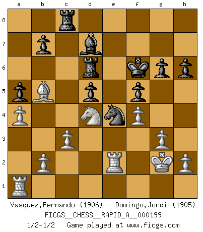 Last move : 1/2-1/2 2017 June 12 19:46:26 [Event "FICGS__CHESS__RAPID_A__000199"] [Site "FICGS"] [Date "2017.02.11"] [Round "1"] [White "Vasquez,Fernando"] [Black "Domingo,Jordi"] [Result "1/2-1/2"] [WhiteElo "1906"] [BlackElo "1905"] 1.e4 e5 2.Nf3 d6 3.d4 exd4 4.Nxd4 Nf6 5.Nc3 Be7 6.Bf4 O-O 7.Qd2 Nc6 8.Be2 Nxd4 9.Qxd4 Be6 10.Rd1 Nd7 11.O-O Bf6 12.Qd2 Re8 13.Be3 Nc5 14.Bd4 Bxd4 15.Qxd4 Bd7 16.f4 Qe7 17.Nd5 Qxe4 18.Qxe4 Rxe4 19.Bf3 Rc4 20.Nxc7 Rc8 21.Nd5 Kf8 22.Rf2 Ra4 23.a3 Bc6 24.g3 Ne4 25.R2f1 f5 26.c3 Re8 27.Nb4 Re6 28.Nc2 Rf6 29.Nd4 d5 30.Be2 Bd7 31.Ra1 Ra5 32.Rfe1 Rc5 33.a4 g6 34.Kg2 Rb6 35.Ra2 a5 36.Bd3 Rc8 37.Bb5 Rd6 38.Re3 Ke7 39.Re2 Kf6 40.Ra1 h6 1/2-1/2 Philidor : Exchange variation Kingside Castling by player Black (move 6) Kingside Castling by player White (move 11) This chess game ended in a draw. Follow this game move after move (download)Half the variations which are calculated in a tournament game turn out to be completely superfluous. Unfortunately, no one knows in advance which half. (Jan Tinman) Modernes Schach erfordert enorme Anspannung. Es ist für einen normalen Menschen unmöglich das auszuhalten. (Viktor Kortschnoi) El Ajedrez es la vida. (Bobby Fischer) Je crois qu'il existe des manières très spécifiques de jouer efficacement contre une machine. Evidemment, nous n'avons aucune chance en technique pure, parce que l'ordinateur calcule de manière parfaite. Mais lorsque nous faisons appel à notre cerveau, en utilisant l'intuition et la compréhension, alors nous restons beaucoup plus forts. (Anatoli Karpov) He who laughs last probably does not get the joke. (Unknown)