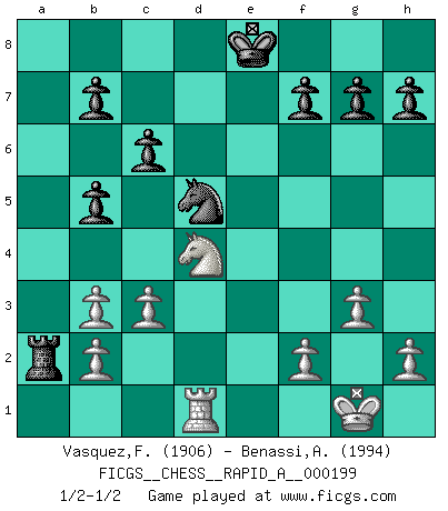 Last move : 1/2-1/2 2017 March 27 2:52:47 [Event "FICGS__CHESS__RAPID_A__000199"] [Site "FICGS"] [Date "2017.02.11"] [Round "1"] [White "Vasquez,Fernando"] [Black "Benassi,Aspasio"] [Result "1/2-1/2"] [WhiteElo "1906"] [BlackElo "1994"] 1.e4 e5 2.Nf3 Nc6 3.d4 exd4 4.Nxd4 Bc5 5.Be3 Qf6 6.c3 Nge7 7.Qd2 O-O 8.Nxc6 Qxc6 9.Bd3 Bxe3 10.Qxe3 d5 11.O-O Qb6 12.Qxb6 axb6 13.Na3 Be6 14.Rfe1 dxe4 15.Bxe4 c6 16.Bc2 Rfd8 17.Bb3 Bxb3 18.axb3 Kf8 19.g3 b5 20.Rad1 Nd5 21.Nc2 Re8 22.Rxe8+ Kxe8 23.Nd4 Ra2 1/2-1/2 Scotch : Blackburne attack Kingside Castling by player Black (move 7) Kingside Castling by player White (move 11) This chess game ended in a draw. Follow this game move after move (download)Fischer was a master of clarity and a king of artful positioning. His opponents would see where he was going but were powerless to stop him. (Bruce Pandolfini) Frage des Reporters: -Welche besonderen Umstände rechtfertigen das Anhalten der Uhren während einer Turnierpartie? Antwort: -Einen Fotographen zu strangulieren. (Siegbert Tarrasch) Cuando tengo las piezas blancas, yo gano porque soy blanco; Cuando tengo las piezas negras, yo gano porque soy Bogolyubov. (Bogolyubov) Les échecs sont un jeu terrible. Si vous n'avez pas le centre, votre adversaire a une position plus libre. Par contre, si vous avez le centre, alors vous avez vraiment quelque chose pour laquelle vous inquiéter ! (Siegbert Tarrasch) When you have everything, sometimes it feels like nothing. (Horatio Caine, C.S.I. Miami)
