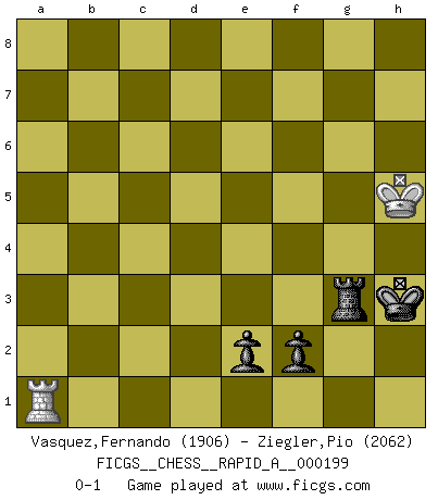 Last move : 0-1 2017 July 7 16:34:25 [Event "FICGS__CHESS__RAPID_A__000199"] [Site "FICGS"] [Date "2017.02.11"] [Round "1"] [White "Vasquez,Fernando"] [Black "Ziegler,Pio"] [Result "0-1"] [WhiteElo "1906"] [BlackElo "2062"] 1.e4 c5 2.c3 Nf6 3.e5 Nd5 4.Nf3 Nc6 5.d4 cxd4 6.cxd4 d6 7.Bc4 Nb6 8.Bb5 dxe5 9.Nxe5 Bd7 10.Bxc6 Bxc6 11.Nxc6 bxc6 12.O-O e6 13.Nc3 Be7 14.Bf4 O-O 15.Rc1 Rc8 16.Re1 Nc4 17.Qg4 Nd6 18.Rcd1 Nf5 19.Be5 Qd7 20.Ne4 Kh8 21.a3 Rfd8 22.b4 Qd5 23.Nc5 h6 24.h3 Qa2 25.Qh5 Kg8 26.Qf3 Qd5 27.Qe2 Nh4 28.Qg4 Ng6 29.Rc1 Qa2 30.Bg3 Bxc5 31.bxc5 Rd7 32.Bd6 Qxa3 33.h4 Ne7 34.Ra1 Qb3 35.Re3 Qb2 36.Rea3 Nf5 37.Be5 Ra8 38.Ra4 Qb7 39.Qe4 Rd5 40.Ra6 Kh8 41.g4 Nxh4 42.Qh1 f6 43.Bxf6 gxf6 44.Qxh4 Kg7 45.R6a3 Qb2 46.Qg3 Rxd4 47.Kh2 a5 48.Re1 Re8 49.Rxa5 Re7 50.Rea1 Qd2 51.Ra8 Qg5 52.Rc8 Rxg4 53.Qxg4 Qxg4 54.Rg1 Qg5 55.Rxg5+ hxg5 56.Rxc6 f5 57.Ra6 Kf6 58.Ra2 Rc7 59.Rc2 Ke5 60.f3 Kd4 61.c6 Kd5 62.Rg2 Rh7+ 63.Kg1 Rg7 64.Rc2 Rc7 65.Rd2+ Kxc6 66.Kf2 Rd7 67.Rb2 Ra7 68.Rc2+ Kd5 69.Rd2+ Ke5 70.Rc2 Ra4 71.Kg3 f4+ 72.Kg4 Ra1 73.Kxg5 Rg1+ 74.Kh6 Kf6 75.Kh5 Kf5 76.Kh6 Rg3 77.Rc3 e5 78.Kh7 Rxf3 79.Rc7 Rg3 80.Rf7+ Ke4 81.Rc7 f3 82.Rc4+ Kd3 83.Ra4 e4 84.Ra3+ Ke2 85.Kh6 e3 86.Ra2+ Kf1 87.Ra1+ Kg2 88.Ra2+ f2 89.Kh5 Kh3 90.Ra1 e2 0-1 Sicilian : Alapin's variation (2.c3) Kingside Castling by player White (move 12) Kingside Castling by player Black (move 14) 10 pieces endgame at move 55 : White KRPP , Black KRPPPP WHITE : King + 1 Rook 2 Pawns BLACK : King + 1 Rook 4 Pawns 9 pieces endgame at move 56 : White KRPP , Black KRPPP WHITE : King + 1 Rook 2 Pawns BLACK : King + 1 Rook 3 Pawns 8 pieces endgame at move 65 : White KRP , Black KRPPP WHITE : King + 1 Rook 1 Pawn BLACK : King + 1 Rook 3 Pawns 7 pieces endgame at move 73 : White KRP , Black KRPP WHITE : King + 1 Rook 1 Pawn BLACK : King + 1 Rook 2 Pawns 6 pieces endgame at move 78 : White KR , Black KRPP WHITE : King + 1 Rook BLACK : King + 1 Rook 2 Pawns Player Black won this chess game. Follow this game move after move (download)You are for me the Queen on d8 and I am the Pawn on d7 !! (Eduard Gufeld) Charakterschwächen offenbaren sich normalerweise während einer Schachpartie. (Garry Kasparov) Las combinaciones han sido siempre el aspecto más intrigante del Ajedrez. Los Maestros las buscan, el público las aplauden, los críticos las alaban. La razón se debe a que las combinaciones hacen posible que el Ajedrez sea más que un ejercicio matemático con una carencia de vida. Ellas son la poesía del juego, son del Ajedrez lo que la melodía es de la música. Ellas representan el triunfo de la mente sobre la materia. (Reuben Fine) Mon pion favori sur ma case favorite ! Bronstein en parlant d'un coup de pion en h5 quand il avait les Noirs. May the force be with you. (Han Solo in Star Wars ep.4)