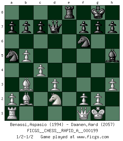 Last move : 1/2-1/2 2017 February 20 18:31:13 [Event "FICGS__CHESS__RAPID_A__000199"] [Site "FICGS"] [Date "2017.02.11"] [Round "1"] [White "Benassi,Aspasio"] [Black "Daanen,Aard"] [Result "1/2-1/2"] [WhiteElo "1994"] [BlackElo "2057"] 1.e4 e5 2.Nf3 Nc6 3.Bc4 Bc5 4.c3 Nf6 5.d3 O-O 6.O-O d5 7.exd5 Nxd5 8.Re1 Bg4 9.h3 Bh5 10.b4 Be7 11.b5 Na5 12.Rxe5 Nf6 13.Nbd2 Bd6 14.Re1 Re8 15.Bb3 Qd7 16.c4 Rxe1+ 17.Qxe1 Re8 18.Qf1 Bb4 19.Bb2 Bxd2 20.Nxd2 1/2-1/2 Giuoco Piano Kingside Castling by player Black (move 5) Kingside Castling by player White (move 6) This chess game ended in a draw. Follow this game move after move (download)If your opponent cannot do anything active, then don't rush the position; instead you should let him sit there, suffer, and beg you for a draw. (Jeremy Silman) Ich bin der einzige Schachspieler, der sich während der Vorbereitungen zum Turnier verletzt hat. (Woody Allen) Si tu oponente no puede hacer nada activo, entonces no apures la posición; En vez de eso, dejalo estar sentado ahí, sufriendo y rogandote por un empate. (Jeremy Silman) Karpov est une pièce de musée. (Garry Kasparov) At work, the authority of a person is inversely proportional to the number of pens that person is carrying. (Dan Rotaru)