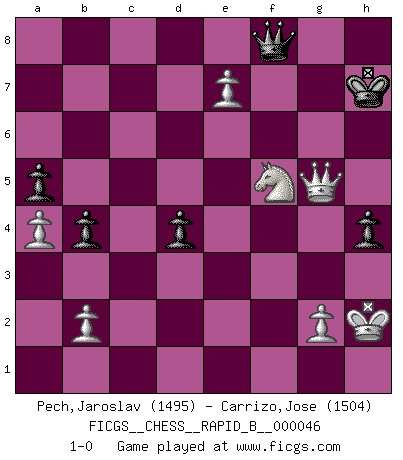 Last move : 1-0 2007 September 6 3:45:20 [Event "FICGS__CHESS__RAPID_B__000046"] [Site "FICGS"] [Date "2007.04.03"] [Round "1"] [White "Pech,Jaroslav"] [Black "Carrizo,Jose"] [Result "1-0"] [WhiteElo "1495"] [BlackElo "1504"] 1.d4 d5 2.c4 e6 3.Nc3 c6 4.Nf3 Nf6 5.e3 Nbd7 6.Bd3 dxc4 7.Bxc4 b5 8.Bd3 a6 9.a4 b4 10.Ne4 c5 11.Nxf6+ Nxf6 12.O-O Bb7 13.dxc5 Bxc5 14.Qe2 Qd5 15.Rd1 Qh5 16.h3 O-O 17.e4 a5 18.Bf4 Rac8 19.Rac1 Rfe8 20.Bb5 Rf8 21.Rc4 Kh8 22.Rdc1 h6 23.e5 Nd5 24.Bg3 Bb6 25.Rxc8 Rxc8 26.Rxc8+ Bxc8 27.Bc6 Qg6 28.Kh2 Qh7 29.Qb5 Bd8 30.Nd2 h5 31.Qb8 Ne7 32.Be4 Qg8 33.Nc4 g5 34.h4 Nd5 35.Qxc8 gxh4 36.Bxd5 hxg3+ 37.fxg3 h4 38.g4 exd5 39.Nd6 Be7 40.Qf5 Kg7 41.Qf3 Kh8 42.Nxf7+ Kg7 43.Nd6 Qe6 44.Qf5 Qg8 45.Qh5 Qf8 46.Nf5+ Kg8 47.Qg6+ Kh8 48.g5 Bxg5 49.Qxg5 d4 50.e6 Kh7 51.e7 1-0 QGD : Semi-Slav Kingside Castling by player White (move 12) Kingside Castling by player Black (move 16) Player White won this chess game. Follow this game move after move (download)The game of Chess is not merely an idle amusement; several very valuable qualities of the mind are to be acquired and strengthened by it, so as to become habits ready on all occasions; for life is a kind of Chess. (Benjamin Franklin) Ich bin stolz ein Bulgare zu sein. (Veselin Topalov) Una de estas pequeñas movidas modestas pudieran ser mas molestas a tu oponente que la amenaza mas grande. (Siegbert Tarrasch) Le système Elo représente seulement une moyenne. Il est simplement un indicateur de votre stabilité. (Anatoli Karpov) Better than a thousand days of diligent study is one day with a great teacher. (Japanese proverb)