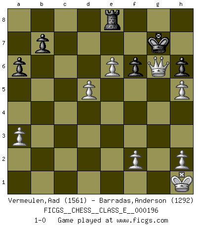 Last move : 1-0 2017 March 16 2:7:22 [Event "FICGS__CHESS__CLASS_E__000196"] [Site "FICGS"] [Date "2017.02.14"] [Round "1"] [White "Vermeulen,Aad"] [Black "Barradas,Anderson"] [Result "1-0"] [WhiteElo "1561"] [BlackElo "1292"] 1.d4 Nf6 2.c4 d5 3.cxd5 Nxd5 4.e4 Nf6 5.Nc3 e6 6.Nf3 Bb4 7.Qc2 a6 8.a3 Ba5 9.Be2 Nc6 10.Be3 O-O 11.O-O Bxc3 12.bxc3 Re8 13.Rfd1 Ne7 14.c4 c6 15.e5 Nh5 16.g4 Bd7 17.gxh5 h6 18.Bd3 Nf5 19.Bxf5 exf5 20.Kh1 Be6 21.Rg1 Kh7 22.Rg2 Rg8 23.Rag1 Qf8 24.Nh4 Rd8 25.Nxf5 Bxf5 26.Qxf5+ Kh8 27.Bxh6 gxh6 28.Rxg8+ Qxg8 29.Rxg8+ Kxg8 30.Qg4+ Kh8 31.Qe4 Re8 32.d5 f6 33.e6 cxd5 34.cxd5 Kg7 35.Qg6+ 1-0 Queen's pawn game Kingside Castling by player Black (move 10) Kingside Castling by player White (move 11) Player White won this chess game. Follow this game move after move (download)The laws of Chess do not permit a free choice: you have to move whether you like it or not. (Emanuel Lasker) Schach sollte überall auf der Welt Schulfach werden. Es fördert die geistige Auseinandersetzung. Es lehrt die Demut in der Niederlage. (Garry Kasparov) Cuando estes solo, cuando te sientas un extraño en el mundo, juega al Ajedrez. Esto levantará tu espiritu y será tu consejero de guerra. (Aristóteles) Plusieurs personnes se sont demandées comment Tal faisait pour gagner... En fait, c'est très simple ! Il met ses pièces au centre de l'échiquier et les sacrifie quelque part ! (David Bronstein) They say in chess you've got to kill the queen, and then you mate it... Oh I, do you ? (Red Hot Chili Peppers, Fortune faded)