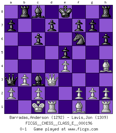 Last move : 0-1 2017 February 24 2:14:41 [Event "FICGS__CHESS__CLASS_E__000196"] [Site "FICGS"] [Date "2017.02.14"] [Round "1"] [White "Barradas,Anderson"] [Black "Lavis,Jon"] [Result "0-1"] [WhiteElo "1292"] [BlackElo "1309"] 1.e4 c5 2.Nf3 Nc6 3.d4 cxd4 4.Nxd4 e5 5.Nxc6 bxc6 6.Nc3 Nf6 7.Bg5 h6 8.Bh4 Rb8 9.b3 Bb4 10.Qd2 Qa5 11.O-O-O Bxc3 12.Qd3 Qa3+ 0-1 Sicilian : Labourdonnais-Loewenthal variation Queenside Castling by player White (move 11) Player Black won this chess game. Follow this game move after move (download)You know you're going to lose. Even when I was ahead I knew I was going to lose. - On playing against Fischer. (Andrew Soltis) Karpov ist ein Museumsstück. (Garry Kasparov) Las piezas de Ajedrez son los bloques del alfabeto que moldean los pensamientos; y esos pensamientos, aunque hagan un diseño visual en el tablero, expresan abstractamente su belleza como un poema. (Marcel Duchamp) Aux échecs, l'amour-propre est satisfait quand on remporte la victoire, mais il n'y a pas de honte à être battu. (Benjamin Franklin) There is far too much law for those who can afford it and far too little for those who cannot. (Derek Bok)
