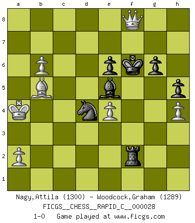 Last move : 1-0 2007 August 29 11:45:28 [Event "FICGS__CHESS__RAPID_C__000028"] [Site "FICGS"] [Date "2007.04.04"] [Round "1"] [White "Nagy,Attila"] [Black "Woodcock,Graham"] [Result "1-0"] [WhiteElo "1300"] [BlackElo "1289"] 1.e4 c5 2.d4 e6 3.Nf3 Nc6 4.Nc3 cxd4 5.Nxd4 Nxd4 6.Qxd4 b6 7.Be3 Bb7 8.O-O-O Nf6 9.f3 g6 10.Qd2 Bg7 11.g4 O-O 12.g5 Nh5 13.Qxd7 Qxd7 14.Rxd7 Bc6 15.Rd6 Rac8 16.Nb5 Bxb5 17.Bxb5 Rc7 18.Rhd1 Be5 19.R6d2 Nf4 20.h4 f5 21.gxf6 Rxf6 22.c4 h5 23.Kc2 R6f7 24.Rh1 Kg7 25.b4 a6 26.Bxa6 Ra7 27.b5 Rac7 28.Kb3 Rfd7 29.Rhd1 Rxd2 30.Rxd2 Kf6 31.Bxb6 Rg7 32.Bd8+ Kf7 33.b6 Ke8 34.Bb5+ Kf8 35.c5 Nh3 36.c6 Ng1 37.c7 Nxf3 38.Rf2 Rf7 39.c8Q Nd4+ 40.Ka4 Rxf2 41.Bf6 Kf7 42.Qe8+ Kxf6 43.Qf8+ 1-0 Sicilian : Smith-Morra gambit Queenside Castling by player White (move 8) Kingside Castling by player Black (move 11) Promotion Queen by player White (move 39) Player White won this chess game. Follow this game move after move (download)I love all positions. Give me a difficult positional game, I will play it. But totally won positions, I cannot stand them. (Hein Donner) Der Umstand, daß uns eine 7 Stunden Zeitkontrolle ermöglicht eine großartige, tiefe Partie zu spielen, ist für die Massenmedien nicht weiter von Bedeutung. (Alexej Shirov) Hay jugadores fuertes y personas amables y yo soy un jugador fuerte. (Bobby Fischer) Dans le domaine de la peinture, de la gravure et de la sculpture, dès la première décennie de notre siècle, les artistes abandonnent la représentation de la partie d'échecs pour se concentrer sur les pièces, sur les échiquiers et sur toutes les variations auxquelles les unes et les autres peuvent donner lieu. On passe en quelque sorte d'un thème social à un thème musical (au sens de la musica médiévale, c'est-à-dire d'une notion qui inclue le rythme, l'harmonie, la construction et la déconstruction, etc.). Graphiquement et picturalement, l'échiquier apparaît comme une structure ouverte, dynamique, d'une richesse infinie, autorisant toutes les combinatoires et débouchant sur des mouvements et des rythmes de nature exponentielle. (Michel Pastoureau) There are 10 types of people in this world: those who understand binary and those who don't. (Anonymous)