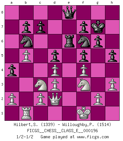 Last move : 1/2-1/2 2017 June 9 12:51:58 [Event "FICGS__CHESS__CLASS_E__000196"] [Site "FICGS"] [Date "2017.02.14"] [Round "1"] [White "Hilbert,Stephan J."] [Black "Willoughby,Peter"] [Result "1/2-1/2"] [WhiteElo "1339"] [BlackElo "1514"] 1.b4 a5 2.b5 Nf6 3.f4 d5 4.Nf3 Bf5 5.Bb2 e6 6.e3 Nbd7 7.Bd3 Bc5 8.Bxf5 exf5 9.O-O O-O 10.Bd4 Re8 11.Nc3 a4 12.Qe1 g6 13.Qh4 Bxd4 14.exd4 Nb6 15.Rae1 Kg7 16.Rxe8 Qxe8 17.d3 Qf8 18.Qf2 Qa3 19.Qd2 h5 20.h3 Re8 21.Rb1 Nfd7 22.Kf2 Nf6 23.Kg1 Re6 24.Kf1 Qf8 25.Ne2 Qe8 26.Nc3 1/2-1/2 Polish (Sokolsky) opening Kingside Castling by player White (move 9) Kingside Castling by player Black (move 9) This chess game ended in a draw. Follow this game move after move (download)In the perfect Chess combination as in a first-rate short story, the whole plot and counter-plot should lead up to a striking finale, the interest not being allayed until the very last moment. (Yates and Winter) Ich verstehe den Grund nicht, warum die Aufteilung in Frauen und Männer überhaupt im Schach besteht. (Judith Polgar) Cuando no sepas que mover, espera por una idea que se le venga a la la cabeza de tu oponente. Tenlo por seguro de que esa idea estará incorrecta. (Siegbert Tarrasch) Mon pion favori sur ma case favorite ! Bronstein en parlant d'un coup de pion en h5 quand il avait les Noirs. Ah, the Socrating method. The best way we have of teaching everything-apart from juggling chainsaws. (Gregory House, House M.D.)