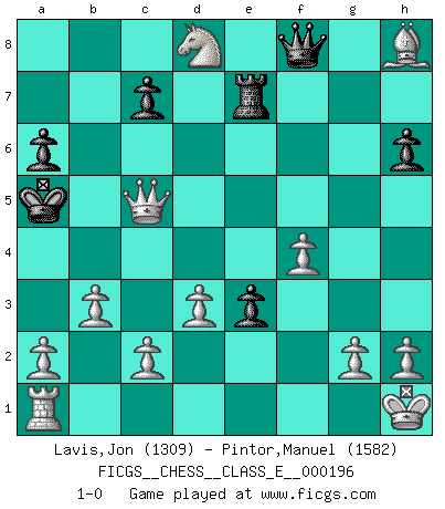 Last move : 1-0 2017 March 7 10:50:50 [Event "FICGS__CHESS__CLASS_E__000196"] [Site "FICGS"] [Date "2017.02.14"] [Round "1"] [White "Lavis,Jon"] [Black "Pintor,Manuel"] [Result "1-0"] [WhiteElo "1309"] [BlackElo "1582"] 1.f4 Nc6 2.Nf3 d5 3.e3 Bg4 4.Bb5 a6 5.Bxc6+ bxc6 6.b3 Nf6 7.Bb2 Ne4 8.d3 Nf6 9.Nbd2 e6 10.O-O h6 11.Qe1 Bc5 12.Ne5 Qd6 13.Qg3 Be2 14.Qxg7 O-O-O 15.Qxf6 Bxe3+ 16.Kh1 Bxf1 17.Nxf1 d4 18.Nxe3 dxe3 19.Nxf7 Qf8 20.Qxe6+ Kb7 21.Bxh8 Re8 22.Qd7 Re7 23.Nd8+ Kb6 24.Qxc6+ Ka5 25.Qc5+ 1-0 Bird's Opening Kingside Castling by player White (move 10) Queenside Castling by player Black (move 14) Player White won this chess game. Follow this game move after move (download)I don't believe in psychology. I believe in good moves. (Bobby Fischer) Ein unbeabsichtigtes Patt ist der Gipfel der Dummheit. (Anonymous) Durante una competencia de Ajedrez, un Maestro de Ajedrez deberá ser una combinación de presa de caza y un Monge. (Alexander Alekhine) Les Echecs, c'est l'art de la guerre sans les charniers, c'est la résurrection des morts tombés au champ d'honneur, l'espoir perpétuel, la suprématie de l'intelligence sur la force, la culture de l'esprit. (F. Szpiner) The next best thing to gambling and winning is gambling and loosing. (Nick Dandalos)