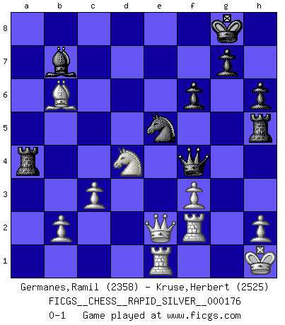 Last move : 0-1 2017 April 17 0:58:13 [Event "FICGS__CHESS__RAPID_SILVER__000176"] [Site "FICGS"] [Date "2017.02.15"] [Round "2"] [White "Germanes,Ramil"] [Black "Kruse,Herbert"] [Result "0-1"] [WhiteElo "2358"] [BlackElo "2525"] 1.e4 e5 2.Nf3 Nc6 3.Bb5 Nf6 4.d3 Bc5 5.c3 O-O 6.Bxc6 bxc6 7.Nxe5 d5 8.d4 Bb6 9.O-O Nxe4 10.Nxc6 Qd6 11.Nb4 a5 12.Nd3 c5 13.Bf4 Qg6 14.dxc5 Bxc5 15.Nxc5 Nxc5 16.Qxd5 Bb7 17.Qg5 Qc6 18.Qg3 Rae8 19.Nd2 Re6 20.f3 Nd3 21.Nb3 Qb6+ 22.Kh1 Ba6 23.Bc7 Qa7 24.Bxa5 Rg6 25.Qh4 Qb8 26.Qe7 Rc8 27.Rab1 Re6 28.Qg5 Rh6 29.g3 f6 30.Qd2 Rh5 31.Nd4 Qxg3 32.a4 Bb7 33.Bb6 Ne5 34.Rbe1 Rc4 35.Qg2 Qf4 36.Qe2 h6 37.Rf2 Rxa4 0-1 Ruy Lopez : Berlin defense Kingside Castling by player Black (move 5) Kingside Castling by player White (move 9) Player Black won this chess game. Follow this game move after move (download)If I win a tournament, I win it by myself. I do the playing. Nobody helps me. (Bobby Fischer) Die meiste Zeit treffe ich auf Gegner, die meine Enkel sein könnten. Ich bin da, um ihnen zu zeigen, dass sie von mir noch einiges lernen können. (Viktor Kortschnoi) Un mal plan es mejor que no tener ningún plan. (Frank Marshall) Le joueur d'Echecs qui veut atteindre le top est obligé de développer son propre credo créatif. Alexeï Stepanovicth Souétine. Il est facile d'écrire des livres ! Ce qui est difficile, c'est de jouer ! (Alexeï Stepanovicth Souétine) It's only after you lost everything, Tyler says, that you're free to do anything. (Chuck Palahniuk, Fight Club)