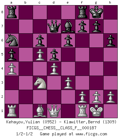 Last move : 1/2-1/2 2017 April 30 19:57:12 [Event "FICGS__CHESS__CLASS_F__000187"] [Site "FICGS"] [Date "2017.02.16"] [Round "1"] [White "Kehayov,Yulian"] [Black "Klawitter,Bernd"] [Result "1/2-1/2"] [WhiteElo "0952"] [BlackElo "1309"] 1.d4 d5 2.e3 c6 3.c4 e6 4.c5 Nf6 5.Nf3 Be7 6.Bd3 h6 7.O-O O-O 8.b4 b6 9.Nc3 bxc5 10.bxc5 a5 11.a4 Ba6 12.Bxa6 Nxa6 13.Ne5 Nd7 14.Nxd7 Qxd7 1/2-1/2 Queen's pawn game Kingside Castling by player White (move 7) Kingside Castling by player Black (move 7) This chess game ended in a draw. Follow this game move after move (download)The game of chess is the touchstone of the intellect. (Goethe) Obwohl ich alt bin, darf mir niemand den Finger in den Mund stecken, sonst beisse ich. (Wilhelm Steinitz) Debemos de asegurarnos de que el Ajedrez no se convierta en un lenguaje muerto, muy interesante, pero solo para un grupo muy pequeño. (Sytze Faber) Pour se monter efficace, un Cavalier a besoin d'avant-postes ! Les Cavaliers font les meilleurs bloqueurs de pions passés. Luck never gives; it only lends. (Swedish proverb)