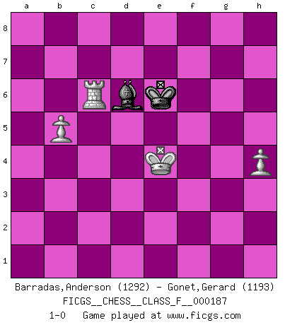 Last move : 1-0 2017 April 10 14:35:56 [Event "FICGS__CHESS__CLASS_F__000187"] [Site "FICGS"] [Date "2017.02.16"] [Round "1"] [White "Barradas,Anderson"] [Black "Gonet,Gerard"] [Result "1-0"] [WhiteElo "1292"] [BlackElo "1193"] 1.e4 e5 2.Nf3 f5 3.exf5 e4 4.Nd4 Qf6 5.c3 a6 6.d3 d5 7.Qh5+ g6 8.fxg6 hxg6 9.Qxd5 exd3 10.Bxd3 Rh5 11.Qf3 Re5+ 12.Be3 Qg7 13.Qg3 Nd7 14.Bxg6+ Kd8 15.O-O Bd6 16.Bg5+ Ne7 17.Bxe7+ Rxe7 18.Qg5 Nf6 19.g3 Re5 20.Qh4 c5 21.Nf3 Re8 22.Bxe8 Kxe8 23.Re1+ Kf8 24.Nbd2 Bd7 25.Ne5 Be8 26.Qf4 Kg8 27.Ndc4 Bc7 28.Rad1 Nh5 29.Qh4 b5 30.Nd6 Qf6 31.Nxe8 Qxh4 32.gxh4 Rxe8 33.Nd7 Rxe1+ 34.Rxe1 c4 35.Re7 Bf4 36.b3 Bd2 37.Nb8 cxb3 38.axb3 Bxc3 39.Nxa6 Bf6 40.Rb7 Bxh4 41.Rxb5 Nf4 42.Re5 Nh3+ 43.Kg2 Nf4+ 44.Kf3 Nd3 45.Re4 Bxf2 46.Nb4 Nxb4 47.Rxb4 Bc5 48.Rc4 Bf8 49.b4 Kf7 50.b5 Bd6 51.h3 Ke8 52.Rc6 Kd7 53.Ke4 Ke6 54.h4 1-0 Latvian counter-gambit Kingside Castling by player White (move 15) 10 pieces endgame at move 40 : White KRNPPP , Black KBNP WHITE : King + 1 Rook 1 Knight 3 Pawns BLACK : King + 1 Bishop 1 Knight 1 Pawn 9 pieces endgame at move 41 : White KRNPPP , Black KBN WHITE : King + 1 Rook 1 Knight 3 Pawns BLACK : King + 1 Bishop 1 Knight 8 pieces endgame at move 45 : White KRNPP , Black KBN WHITE : King + 1 Rook 1 Knight 2 Pawns BLACK : King + 1 Bishop 1 Knight 7 pieces endgame at move 46 : White KRPP , Black KBN WHITE : King + 1 Rook 2 Pawns BLACK : King + 1 Bishop 1 Knight 6 pieces endgame at move 47 : White KRPP , Black KB WHITE : King + 1 Rook 2 Pawns BLACK : King + 1 Bishop Player White won this chess game. Follow this game move after move (download)I like to say that Bobby Fischer was the greatest player ever. But what made Fischer a genius was his ability to blend an American freshness and pragmatism with Russian ideas about strategy. (Bruce Pandolfini) Jeder Schachmeister war einmal ein Anfänger. (Irving Chernev) El poder defensivo de una pieza clavada, solamente es imaginario. (Aaron Nimzovich) La solitude du joueur d'Echecs à l'approche du mat est semblable à celle du condamné. (Francis Szpiner) If you lose the game you should win the analysis! (Proverb)