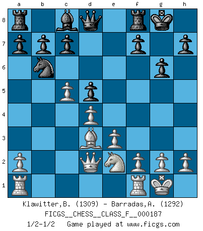 Last move : 1/2-1/2 2017 February 28 7:33:56 [Event "FICGS__CHESS__CLASS_F__000187"] [Site "FICGS"] [Date "2017.02.16"] [Round "1"] [White "Klawitter,Bernd"] [Black "Barradas,Anderson"] [Result "1/2-1/2"] [WhiteElo "1309"] [BlackElo "1292"] 1.c4 Nf6 2.d4 e6 3.Nc3 Bb4 4.e3 Ne4 5.Qc2 Nxc3 6.bxc3 Ba5 7.Bd2 O-O 8.Bd3 g6 9.Ne2 d5 10.O-O Nd7 11.cxd5 exd5 12.c4 Bxd2 13.Qxd2 Nb6 14.c5 1/2-1/2 English, 1...Nf6 (Anglo-Indian defense) Kingside Castling by player Black (move 7) Kingside Castling by player White (move 10) This chess game ended in a draw. Follow this game move after move (download)I love all positions. Give me a difficult positional game, I will play it. But totally won positions, I cannot stand them. (Hein Donner) Es ist schade, dass viele Schachsportler vergessen, wie wichtig Auftreten und angemessene Kleidung sind. (Alexandra Kosteniuk) Tu eres para mi la Reina en d8 y yo soy el Peón en d7!!. (GM Eduard Gufeld) Ce qui est bien, c'est d'avoir tout un tas de pièces en prise : l'adversaire ne peut en prendre qu'une à la fois. Cité par Thierry Audin. A computer lets you make more mistakes faster than any invention in human history - with the possible exceptions of handguns and tequila. (Mitch Ratcliffe)
