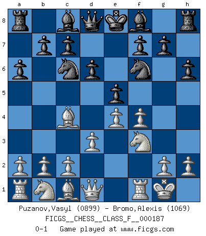 Last move : 0-1 2017 April 22 23:34:0 [Event "FICGS__CHESS__CLASS_F__000187"] [Site "FICGS"] [Date "2017.02.16"] [Round "1"] [White "Puzanov,Vasyl"] [Black "Bromo,Alexis"] [Result "0-1"] [WhiteElo "0899"] [BlackElo "1069"] 1.e4 e5 2.f4 d6 3.Nf3 Nc6 4.Bc4 h6 5.d3 Nf6 6.O-O a6 0-1 This chess game has been lost on time (started : 2017.02.16 17:32:49) King's gambit Kingside Castling by player White (move 6) Player Black won this chess game. Follow this game move after move (download)Examine moves that smite! A good eye for smites is far more important than a knowledge of strategical principles. (Purdy) Ich organisiere ein großes Turnier, was mich etwa 120000 Dollar kostet. Ich denke, das ist das erste Mal in der Schachgeschichte, daß ein Schachgroßmeister auch als Mäzen auftritt. (Miguel Najdorf) La estratégia requiere pensar, la táctica requiere observación. (Max Euwe) J'ai toujours senti une vague pitié pour l'homme qui ne connaît rien aux échecs, tout comme j'en aurais pour un homme ignorant de l'amour. Les Echecs, comme la musique ou comme l'amour, ont le pouvoir de rendre heureux. (Siegbert Tarrasch) Life is like a play: it's not the length but the excellence of the acting that matters. (Seneca)
