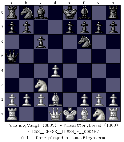 Last move : 0-1 2017 March 30 22:8:18 [Event "FICGS__CHESS__CLASS_F__000187"] [Site "FICGS"] [Date "2017.02.16"] [Round "1"] [White "Puzanov,Vasyl"] [Black "Klawitter,Bernd"] [Result "0-1"] [WhiteElo "0899"] [BlackElo "1309"] 1.e4 d5 2.exd5 Qxd5 3.Nc3 Qa5 4.d4 Nf6 5.Bd2 c6 0-1 This chess game has been lost on time (started : 2017.02.16 17:32:49) Scandinavian (centre counter) defense Player Black won this chess game. Follow this game move after move (download)During a Chess competition a Chessmaster should be a combination of a beast of prey and a monk. (Alexander Alekhine) Ich hatte meine größten Erfolge, als ich 47 Jahre alt war. Kasparow war noch nicht mal 42 und hat das Schach schon im Stich gelassen. (Viktor Kortschnoi) A través de las casillas del tablero, los Indios explican el movimiento del tiempo y la edad, las influencias mas altas que controlan el mundo y los lazos que vinculan al Ajedrez con el alma humana. (Al-Masudi) Le génie consiste à savoir transgresser les règles au moment opportun. (Teichmann) It's unlucky to be superstitious. (Dave Enteles)