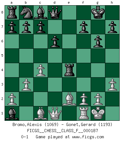 Last move : 0-1 2017 March 19 12:44:22 [Event "FICGS__CHESS__CLASS_F__000187"] [Site "FICGS"] [Date "2017.02.16"] [Round "1"] [White "Bromo,Alexis"] [Black "Gonet,Gerard"] [Result "0-1"] [WhiteElo "1069"] [BlackElo "1193"] 1.d4 Nf6 2.c4 g6 3.Nc3 Bg7 4.e3 d6 5.h3 O-O 6.Nf3 Re8 7.b3 e5 8.e4 exd4 9.Nxd4 Nxe4 10.Nxe4 Rxe4+ 11.Be2 Bxd4 12.O-O Bxa1 0-1 King's Indian defense, 3.Nc3 Kingside Castling by player Black (move 5) Kingside Castling by player White (move 12) Player Black won this chess game. Follow this game move after move (download)Only sissies Castle. (Rob Sillars) Besser ein falscher Plan, logisch durchgeführt, als gar kein Plan. (Viktor Kortschnoi) El arma más poderosa en el Ajedrez, es tener la próxima movida. (David Bronstein) Mais l'homme est une créature légère et illogique : semblable au joueur d'échecs, il n'aime que le processus du but à atteindre, non le but lui-même. (Dostoïevsky) Before all elsed, be armed. (Niccolo Machiavelli)