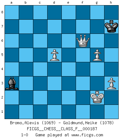 Last move : 1-0 2017 August 4 8:37:58 [Event "FICGS__CHESS__CLASS_F__000187"] [Site "FICGS"] [Date "2017.02.16"] [Round "1"] [White "Bromo,Alexis"] [Black "Goldmund,Heike"] [Result "1-0"] [WhiteElo "1069"] [BlackElo "1078"] 1.d4 Nf6 2.c4 e6 3.a3 c5 4.e3 b6 5.Nc3 Bb7 6.Nf3 Be7 7.Be2 d6 8.O-O O-O 9.h3 a6 10.b3 Qc7 11.Qc2 Nbd7 12.e4 cxd4 13.Nxd4 Nc5 14.Bf3 e5 15.Nf5 Bd8 16.Bg5 Ne6 17.Bxf6 gxf6 18.Nd5 Bxd5 19.exd5 Nc5 20.Nh6+ Kh8 21.Bh5 Qd7 22.b4 Nb7 23.Bg4 Qe7 24.Bf5 Kg7 25.Ng4 h5 26.Qe2 Rg8 27.Ne3 Kh6 28.Bg4 f5 29.Nxf5+ Kh7 30.Nxe7 Bxe7 31.Bxh5 Rg7 32.f4 f6 33.fxe5 fxe5 34.Rf7 Rag8 35.Raf1 Nd8 36.Rxg7+ Rxg7 37.c5 bxc5 38.Qxa6 Kh6 39.g4 Bg5 40.Qxd6+ Kh7 41.bxc5 Be3+ 42.Kg2 Nb7 43.Qxe5 Bxc5 44.Qf5+ Kh8 45.Bf7 Nd6 46.Qh5+ Rh7 47.Qg6 Nxf7 48.Rxf7 Rxf7 49.Qxf7 Bxa3 50.Qf6+ Kh7 51.g5 1-0 Queen's pawn game Kingside Castling by player White (move 8) Kingside Castling by player Black (move 8) 10 pieces endgame at move 48 : White KQRPPPP , Black KRB WHITE : King + 1 Queen 1 Rook 4 Pawns BLACK : King + 1 Rook 1 Bishop 9 pieces endgame at move 48 : White KQPPPP , Black KRB WHITE : King + 1 Queen 4 Pawns BLACK : King + 1 Rook 1 Bishop 8 pieces endgame at move 49 : White KQPPPP , Black KB WHITE : King + 1 Queen 4 Pawns BLACK : King + 1 Bishop 7 pieces endgame at move 49 : White KQPPP , Black KB WHITE : King + 1 Queen 3 Pawns BLACK : King + 1 Bishop Player White won this chess game. Follow this game move after move (download)Who is your opponent tonight, tonight I am playing against the Black pieces. (Akiba Rubinstein) Fallen sollten polizeilich verboten werden. (Savielly Grigorievitsch Tartakower) Juega la Apertura como un libro, el Juego Medio como un mago y los Finales como una máquina. (Spielmann) Je menace de comprendre la position. (Anonyme) There is no instance of a country having benefited from prolonged warfare. (Sun Tzu)