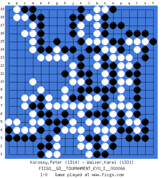 Last move : 1-0 2017 July 4 18:34:55 [Event "FICGS__GO__TOURNAMENT_KYU_I__000066"] [Site "FICGS"] [Date "2017.02.18"] [Round "1"] [Black "Korossy,Peter"] [White "Walzer,Karel"] [Result "1-0"] [Rating 1 "1314"] [Rating 2 "1331"] 1.q16 d4 2.q3 c16 3.e17 d17 4.e16 d14 5.j16 d10 6.f3 f4 7.c3 c4 8.d3 g3 9.f2 c7 10.r9 q5 11.r6 r5 12.r3 q6 13.r7 o4 14.o3 n4 15.k11 k10 16.h11 r14 17.r12 q13 18.r16 q12 19.q11 o13 20.n17 n10 21.h5 h4 22.g5 j4 23.g4 n3 24.o2 m16 25.l14 n15 26.f14 m17 27.o17 k6 28.k8 h7 29.f6 h9 30.l10 j10 31.l9 j11 32.k12 j12 33.k13 p9 34.n8 h13 35.j14 f13 36.e4 g2 37.o11 o7 38.m6 m5 39.n6 o6 40.p15 m12 41.l11 q10 42.r10 p11 43.r11 n11 44.o9 p8 45.l6 l5 46.n13 o14 47.o10 p10 48.o12 p12 49.n12 f8 50.m2 k2 51.l3 k4 52.e7 d8 53.h14 g13 54.e14 e13 55.k18 m18 56.n18 k17 57.j17 k16 58.k15 l18 59.j18 n2 60.n1 l2 61.m3 g14 62.g15 d16 63.n5 m4 64.s3 s15 65.s16 o5 66.s13 e5 67.f5 d6 68.b3 b4 69.a4 a5 70.a3 b5 71.e8 e9 72.s5 m13 73.m14 n14 74.n7 k7 75.j8 j7 76.s14 l7 77.n9 l8 78.k9 r15 79.t15 h8 80.d18 c18 81.e18 r4 82.s4 f1 83.e1 g1 84.e2 k3 85.p4 q7 86.d7 c8 87.c19 b19 88.d19 b18 89.r8 l1 90.m1 j5 91.p14 p13 92.n16 m15 93.e15 l15 94.p5 d15 95.h6 f7 96.e6 d5 97.o15 m8 98.m9 n19 99.o19 m19 100.p6 p7 101.q4 g7 102.k19 q15 103.p17 1-0 Here are the names of the openings (joseki) played in the four corners : Corner d16 : c16 e17 Komoku (Somok, Xiao~mu`) 3-4 Point. The komoku (3-4) point is the traditional corner enclosure move.. Ikken Kakari (Hankan Keolch'im, Yi Gua`jiao~, 1-Space Low Pincer). The small knight move is the basic approach move to the 3-4 point stone. It has been continually used for over four centuries. There are limitless variations, with new moves constantly being discovered. Black 2 opens the door to a treaure store of joseki. Corner d4 : d4 f3 Hoshi (Hwajeom, Seongjeom, Xingwei`) 4-4 Point. The star or hoshi (4-4) point, emphasizing influence at the potential expense of territory. Ikken Kakari (Hankan Keolch'im, Yi Gua`jiao~, 1-Space Low Approach). Black 2 is the standard approach move to the 4-4. Corner q16 : q16 r14 Hoshi (Hwajeom, Seongjeom, Xingwei`) 4-4 Point. The star or hoshi (4-4) point, emphasizing influence at the potential expense of territory. Ikken Kakari (Hankan Keolch'im, Yi Gua`jiao~, 1-Space Low Approach). White 2 is the standard approach move to the 4-4. Player Black won this Go (weiqi, baduk) game. Follow this game move after move (download)Always remember, keep the balance. [between territory and influence] (Figaro) I take risks, sometimes patients die, but not taking risks causes more patients to die. So I guess my biggest problem is I've been cursed with the ability to do the math. (Gregory House, House M.D.)