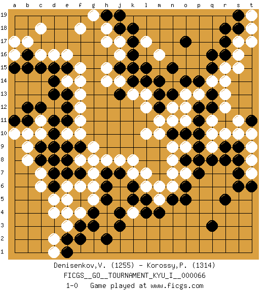 Last move : 1-0 2017 May 27 17:27:10 [Event "FICGS__GO__TOURNAMENT_KYU_I__000066"] [Site "FICGS"] [Date "2017.02.18"] [Round "1"] [Black "Denisenkov,Valentin"] [White "Korossy,Peter"] [Result "1-0"] [Rating 1 "1255"] [Rating 2 "1314"] 1.q16 d4 2.q3 d16 3.f3 f4 4.g4 e3 5.f5 e4 6.g3 c7 7.r5 r14 8.o17 q11 9.r9 q9 10.q8 r10 11.p9 q10 12.r8 l17 13.c12 c10 14.c15 c16 15.d15 e16 16.e11 h17 17.e9 l10 18.p14 s16 19.r17 s17 20.s18 t18 21.r18 f13 22.e13 f14 23.l4 l6 24.p8 g5 25.h5 g6 26.h6 g7 27.h7 k8 28.j13 f12 29.e12 g9 30.e7 e6 31.d7 c6 32.c8 b8 33.d6 e5 34.c9 b9 35.d10 c11 36.b12 f10 37.d11 b10 38.m14 l13 39.l14 k13 40.k14 j14 41.m13 l12 42.b16 b17 43.b15 c18 44.j15 h14 45.n5 n7 46.o6 m16 47.n15 k15 48.k16 j16 49.l15 h15 50.k17 o9 51.o8 n8 52.o10 n9 53.p10 k4 54.k5 h4 55.j4 h3 56.h2 h8 57.k6 l7 58.j18 h18 59.q13 r13 60.q12 r12 61.p11 s10 62.e2 d2 63.f2 t7 64.s7 t8 65.t6 t9 66.s6 n11 67.n10 m10 68.e15 f15 69.k15 o12 70.m12 m11 71.j7 o7 72.p7 o13 73.o14 d1 74.e1 m5 75.m4 n6 76.o5 f8 77.e8 q14 78.r16 r15 79.q15 e14 80.d14 j17 81.k18 f11 82.f7 f6 83.f9 j8 84.h19 g19 85.j19 f18 86.l5 m6 87.a11 a10 88.s9 d5 89.t11 s11 90.s8 t10 91.b11 d9 92.d8 e10 93.g8 a16 94.a15 a17 95.d13 f8 96.d9 g8 97.n13 t17 98.s19 s15 99.pass p13 100.p12 o11 101.pass pass 102.pass k7 103.j3 n12 104.pass t19 105.pass 1-0 Here are the names of the openings (joseki) played in the four corners : Corner d4 : d4 f3 Hoshi (Hwajeom, Seongjeom, Xingwei`) 4-4 Point. The star or hoshi (4-4) point, emphasizing influence at the potential expense of territory. Ikken Kakari (Hankan Keolch'im, Yi Gua`jiao~, 1-Space Low Approach). Black 2 is the standard approach move to the 4-4. Corner q16 : q16 r14 Hoshi (Hwajeom, Seongjeom, Xingwei`) 4-4 Point. The star or hoshi (4-4) point, emphasizing influence at the potential expense of territory. Ikken Kakari (Hankan Keolch'im, Yi Gua`jiao~, 1-Space Low Approach). White 2 is the standard approach move to the 4-4. Corner d16 : d16 c12 Hoshi (Hwajeom, Seongjeom, Xingwei`) 4-4 Point. The star or hoshi (4-4) point, emphasizing influence at the potential expense of territory. Player Black won this Go (weiqi, baduk) game. Follow this game move after move (download)Don't count territory held by only one eye. (Anonymous) No, I am still playing. (Anatoly Karpov)