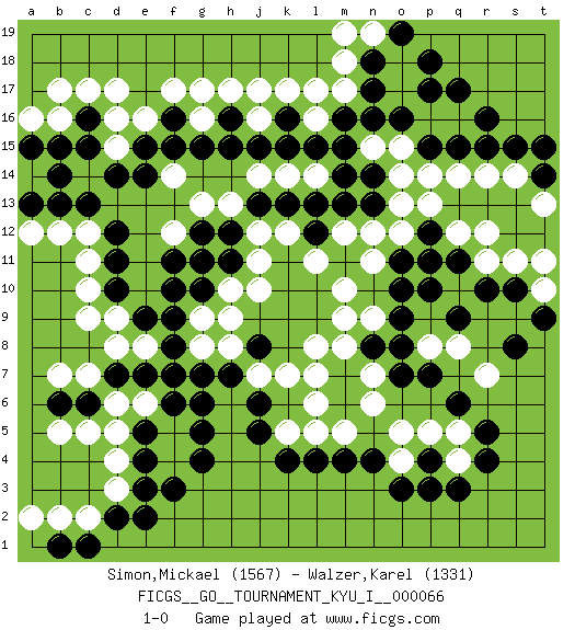 Last move : 1-0 2017 March 29 12:57:46 [Event "FICGS__GO__TOURNAMENT_KYU_I__000066"] [Site "FICGS"] [Date "2017.02.18"] [Round "1"] [Black "Simon,Mickael"] [White "Walzer,Karel"] [Result "1-0"] [Rating 1 "1567"] [Rating 2 "1331"] 1.r16 d17 2.q3 d4 3.p17 d15 4.r5 q16 5.q17 p16 6.o16 q14 7.r15 o15 8.n16 n15 9.m16 r14 10.k4 q10 11.f3 f4 12.g4 f5 13.e3 d3 14.g5 d8 15.c13 c11 16.c16 d16 17.c15 c17 18.d14 g16 19.f6 e6 20.g6 k17 21.m15 r7 22.p7 l6 23.m4 n6 24.q6 q8 25.m13 m18 26.n18 l17 27.q15 p14 28.p15 o13 29.e7 d6 30.d11 c10 31.d10 d9 32.n8 l8 33.j15 j16 34.h15 g8 35.f8 g9 36.d7 c7 37.f9 m10 38.h16 h17 39.m7 l7 40.m6 l5 41.l4 m9 42.c6 c5 43.b6 b7 44.e4 b5 45.e5 d5 46.o10 n11 47.o11 n12 48.n13 o12 49.q11 r11 50.r10 q12 51.q9 p11 52.p10 m5 53.q11 n7 54.p12 r12 55.o8 m8 56.n4 o5 57.k16 j17 58.g15 j12 59.f16 g17 60.e14 g13 61.g10 h10 62.h11 g11 63.f10 j10 64.h12 h13 65.g12 f12 66.f11 j11 67.g11 k14 68.k15 f14 69.j8 j7 70.h7 h8 71.g7 h9 72.j6 k7 73.e15 o4 74.o3 q4 75.p4 p5 76.p3 q5 77.r4 c12 78.d12 b17 79.l12 l11 80.j13 j14 81.k13 l14 82.l13 e16 83.f15 a14 84.b14 b12 85.a13 b16 86.b15 a12 87.b13 f17 88.s10 s11 89.d2 c2 90.e2 s14 91.s15 k5 92.j5 m17 93.n17 l16 94.l15 n19 95.o19 m19 96.p18 o14 97.n14 t10 98.t9 t11 99.s8 n9 100.o9 e8 101.f7 a16 102.a15 p13 103.c1 b2 104.p11 p8 105.o7 k12 106.e9 c9 107.b1 m12 108.m14 a2 109.t14 t13 110.t15 1-0 Here are the names of the openings (joseki) played in the four corners : Corner d4 : d4 f3 Hoshi (Hwajeom, Seongjeom, Xingwei`) 4-4 Point. The star or hoshi (4-4) point, emphasizing influence at the potential expense of territory. Ikken Kakari (Hankan Keolch'im, Yi Gua`jiao~, 1-Space Low Approach). Black 2 is the standard approach move to the 4-4. Player Black won this Go (weiqi, baduk) game. Follow this game move after move (download)Those who are good at winning, don't usually fight. (Zhang) The age of a woman doesn't mean a thing. The best tunes are played on the oldest fiddles. (Ralph Waldo Emerson)