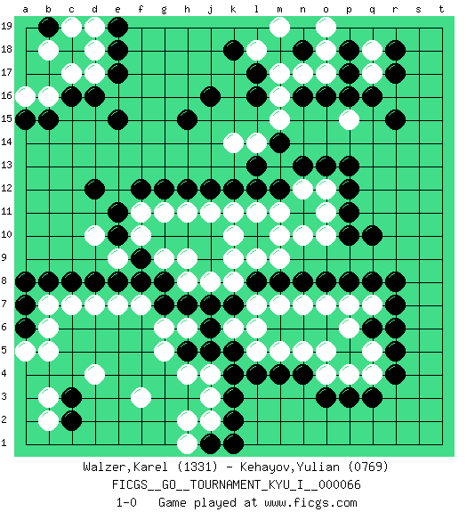 Last move : 1-0 2017 June 12 10:25:33 [Event "FICGS__GO__TOURNAMENT_KYU_I__000066"] [Site "FICGS"] [Date "2017.02.18"] [Round "1"] [Black "Walzer,Karel"] [White "Kehayov,Yulian"] [Result "1-0"] [Rating 1 "1331"] [Rating 2 "0769"] 1.d16 q17 2.q3 d4 3.r5 c17 4.c16 d17 5.e17 d18 6.e18 b16 7.b15 a16 8.a15 b18 9.e15 f3 10.r15 d10 11.d12 j4 12.l4 m16 13.q10 k10 14.j16 l6 15.k5 k6 16.j5 h4 17.h5 g5 18.h7 h6 19.j6 g6 20.k7 l7 21.l8 k8 22.j7 k9 23.m8 m5 24.m4 n5 25.n4 n7 26.n8 o7 27.o8 p7 28.r8 o4 29.o3 p4 30.p3 q5 31.r6 m7 32.q6 p6 33.o16 q4 34.r4 o5 35.p8 q7 36.q8 h8 37.g7 f7 38.g8 h9 39.f8 e7 40.e8 d7 41.d8 c7 42.c8 b7 43.b8 g9 44.q16 o17 45.n16 n17 46.r17 q18 47.l17 m17 48.l16 m15 49.j12 j11 50.k12 h11 51.h12 g11 52.g12 f11 53.e10 e9 54.f9 f10 55.e11 j8 56.f12 k11 57.n13 m11 58.n11 m10 59.l13 n10 60.r18 l18 61.k18 m19 62.p18 n12 63.o13 o11 64.p17 m13 65.m14 l14 66.m12 o12 67.p13 o10 68.c3 o18 69.p12 k14 70.h15 b2 71.c2 b3 72.k3 j3 73.k2 j2 74.j1 h2 75.a7 b6 76.a6 b5 77.b19 c19 78.e19 d19 79.p10 l11 80.l12 l9 81.r7 m9 82.p11 a5 83.a8 h1 84.k1 l5 85.k4 o19 86.n18 p15 87.p16 1-0 Here are the names of the openings (joseki) played in the four corners : Corner d16 : d16 c17 Hoshi (Hwajeom, Seongjeom, Xingwei`) 4-4 Point. The star or hoshi (4-4) point, emphasizing influence at the potential expense of territory. Corner q16 : q17 r15 Komoku (Somok, Xiao~mu`) 3-4 Point. The komoku (3-4) point is the traditional corner enclosure move.. Ikken Kakari (Hankan Keolch'im, Yi Gua`jiao~, 1-Space Low Pincer). The small knight move is the basic approach move to the 3-4 point stone. It has been continually used for over four centuries. There are limitless variations, with new moves constantly being discovered. Black 2 opens the door to a treaure store of joseki. Player Black won this Go (weiqi, baduk) game. Follow this game move after move (download)Use a wall to attack, not to make territory. (Anonymous) Wipe them out. All of them. (Darth Sidious in Star Wars ep.1)