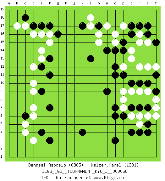 Last move : 1-0 2017 March 1 16:18:2 [Event "FICGS__GO__TOURNAMENT_KYU_I__000066 "] [Site "FICGS"] [Date "2017.02.18"] [Round "1"] [Black "Benassi,Aspasio "] [White "Walzer,Karel "] [Result "1-0"] [Rating 1 "0805"] [Rating 2 "1331"] 1.q16 d16 2.q4 c4 3.e4 d3 4.f3 d6 5.k4 d10 6.f17 f16 7.g16 f15 8.d17 c17 9.e17 e16 10.c18 b17 11.r10 o16 12.m17 q14 13.p15 o15 14.p14 q13 15.o14 m15 16.n14 m16 17.k17 p17 18.q17 n17 19.p11 r15 20.s16 p12 21.o11 l17 22.o3 q6 23.o6 r5 24.r4 r9 25.s10 p9 26.c6 c5 27.n9 s9 28.q10 q9 29.f7 d7 30.e9 d9 31.f11 e13 32.e12 d12 33.f13 e14 34.l13 l18 35.s5 s6 36.s4 r16 37.r17 s15 38.s17 s12 39.s7 t6 40.r7 r6 41.q7 p7 42.p6 t7 43.o7 p8 44.t9 t8 45.t11 t12 46.o12 r12 47.t15 1-0 Here are the names of the openings (joseki) played in the four corners : Corner d4 : c4 e4Komoku (Somok, Xiao~mu`) 3-4 Point. The komoku (3-4) point is the traditional corner enclosure move..Ikken Takagakari (Hankan Nop'dakeolch'im, Yi Gaogua`jiao~, 1-Space High Approach). The 5-4 approach move has become more popular in modern times, as modern Go emphasizes speed and influence. Corner d16 : d16 f17Hoshi (Hwajeom, Seongjeom, Xingwei`) 4-4 Point. The star or hoshi (4-4) point, emphasizing influence at the potential expense of territory.Ikken Kakari (Hankan Keolch'im, Yi Gua`jiao~, 1-Space Low Approach). Black 2 is the standard approach move to the 4-4. Corner q16 : q16 o16Hoshi (Hwajeom, Seongjeom, Xingwei`) 4-4 Point. The star or hoshi (4-4) point, emphasizing influence at the potential expense of territory.Ikken Takagakari (Hankan Nop'dakeolch'im, Yi Gaojia, 1-Space High Approach). Black typically responds at 6-4 or 3-10. Black 4-10 is played when Black finds play on the right side advantageous. Black 4-8 or 3-8 may be played when Black has support at top. Player Black won this Go (weiqi, baduk) game.Follow this game move after move (download ) A basic: Don't push too hard. (Jansteen) Do you know these so called Volunteers don't even get paid! (Simpsons)