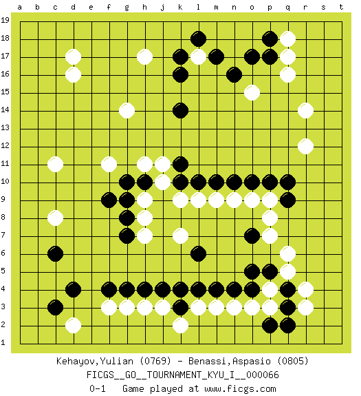 Last move : 0-1 2017 July 8 11:15:52 [Event "FICGS__GO__TOURNAMENT_KYU_I__000066"] [Site "FICGS"] [Date "2017.02.18"] [Round "1"] [Black "Kehayov,Yulian"] [White "Benassi,Aspasio"] [Result "0-1"] [Rating 1 "0769"] [Rating 2 "0805"] 1.d4 q16 2.q3 d16 3.k4 q6 4.k16 r3 5.q4 r4 6.p5 q5 7.c6 p4 8.o4 p3 9.q2 o3 10.o5 n3 11.n4 m3 12.m4 l3 13.l4 j3 14.k3 k2 15.j4 h3 16.h4 c11 17.o17 r14 18.q10 o15 19.n16 h17 20.k17 d17 21.p17 q17 22.p18 r12 23.p2 l17 24.l18 g3 25.g4 f3 26.f4 p7 27.o7 p9 28.p10 o9 29.o10 n9 30.n10 m9 31.m10 l9 32.l10 k9 33.k10 g14 34.k14 c8 35.g9 k7 36.l6 f11 37.f9 d2 38.c3 q18 39.m17 j10 40.k11 p8 41.q9 h7 42.g7 h8 43.g8 h9 44.g10 h11 45.h10 j11 0-1 This go game has been lost on time (started : 2017.02.18 11:22:11) Here are the names of the openings (joseki) played in the four corners : Corner q4 : q3 q6 Komoku (Somok, Xiao~mu`) 3-4 Point. The komoku (3-4) point is the traditional corner enclosure move.. Niken Takagakari (Dukan Nop'dakeolch'im, E`r Gaojia, 2-Space High Approch). The great master Honinbo Shuei (1852-1906) favored the two-space high (niken taka-gakari) approach, especially in two stone handicap games. This approach move was very popular in the 1910s. Wu Qingyuan = Go Seigen frequently played this way, considering it a good "whole board" approach. In recent years, O Rissei has often used the two-space high approach. Corner q16 : q16 o17 Hoshi (Hwajeom, Seongjeom, Xingwei`) 4-4 Point. The star or hoshi (4-4) point, emphasizing influence at the potential expense of territory. Ikken Kakari (Hankan Keolch'im, Yi Gua`jiao~, 1-Space Low Approach). Black 2 is the standard approach move to the 4-4. Player White won this Go (weiqi, baduk) game. Follow this game move after move (download)Fighting must not be the key to go, it should be reserved as your last resource. (Zhong-Pu Liu, about Weiqi) In fact if nothing is done against this teddy bear, hereby I announce that I would quit chess, rapid chess, blitz chess, postal chess, email chess, server chess and correspondence chess I will then switch to a table game where teddy bears aren't going to be seen for a while, like Poker, or Roulette, all 18+ games. (Elmer Valderrama)