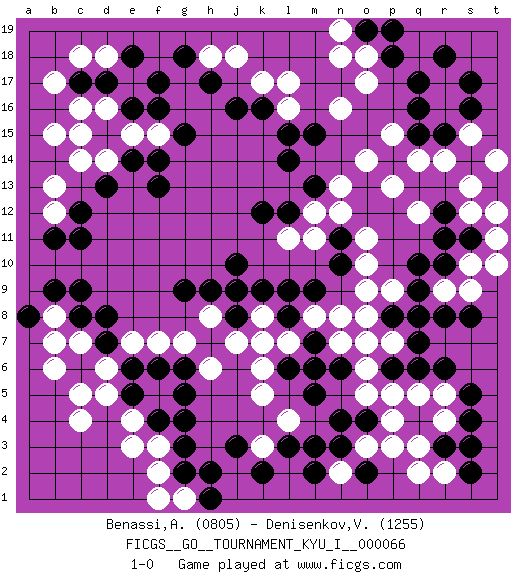Last move : 1-0 2017 March 2 18:50:36 [Event "FICGS__GO__TOURNAMENT_KYU_I__000066"] [Site "FICGS"] [Date "2017.02.18"] [Round "1"] [Black "Benassi,Aspasio"] [White "Denisenkov,Valentin"] [Result "1-0"] [Rating 1 "0805"] [Rating 2 "1255"] 1.q16 c4 2.q4 o3 3.r6 q2 4.r3 d16 5.m3 r2 6.s2 o5 7.j3 f3 8.m5 o7 9.q9 n2 10.f17 c14 11.k16 r17 12.q17 r16 13.r15 s15 14.s14 r14 15.q15 s13 16.s16 t14 17.s17 q14 18.r12 s12 19.p14 q12 20.r18 p13 21.c9 o14 22.c12 p15 23.c6 e17 24.f16 n16 25.c17 c16 26.e18 c18 27.d17 d18 28.e16 b17 29.m7 o9 30.p6 o6 31.m9 o11 32.f4 e4 33.g3 f5 34.g4 e3 35.e5 d5 36.e6 d6 37.d7 e7 38.f6 c7 39.d8 b6 40.f13 f7 41.g6 g7 42.g9 h6 43.g5 h8 44.j10 k7 45.h9 k5 46.j8 k8 47.k9 l17 48.m2 k17 49.d13 b13 50.p8 o8 51.n10 o10 52.j16 s9 53.s8 r9 54.r8 p7 55.q7 p5 56.n3 q5 57.q6 r5 58.s5 r4 59.s4 q3 60.s3 b12 61.c11 b8 62.c8 c5 63.l14 m12 64.l12 m11 65.l9 l11 66.k12 h18 67.h17 e15 68.d15 d14 69.e14 f15 70.g15 c15 71.f14 b15 72.r10 s10 73.s11 t11 74.r11 t10 75.q10 p9 76.q8 o17 77.p18 o18 78.g18 j18 79.g2 f2 80.o2 t12 81.o4 p3 82.n4 p4 83.o19 n19 84.p19 n18 85.b9 m8 86.l8 m6 87.l6 l7 88.n6 n8 89.m13 n13 90.n11 n12 91.m15 l16 92.l15 g1 93.h1 f1 94.h2 n7 95.m6 l4 96.a8 b7 97.b11 k3 98.k2 j7 99.j9 k6 100.l3 1-0 Here are the names of the openings (joseki) played in the four corners : Corner q4 : q4 o3 Hoshi (Hwajeom, Seongjeom, Xingwei`) 4-4 Point. The star or hoshi (4-4) point, emphasizing influence at the potential expense of territory. Ikken Kakari (Hankan Keolch'im, Yi Gua`jiao~, 1-Space Low Approach). White 2 is the standard approach move to the 4-4. Corner d4 : c4 j3 Komoku (Somok, Xiao~mu`) 3-4 Point. The komoku (3-4) point is the traditional corner enclosure move.. Corner d16 : d16 f17 Hoshi (Hwajeom, Seongjeom, Xingwei`) 4-4 Point. The star or hoshi (4-4) point, emphasizing influence at the potential expense of territory. Ikken Kakari (Hankan Keolch'im, Yi Gua`jiao~, 1-Space Low Approach). Black 2 is the standard approach move to the 4-4. Corner q16 : q16 r17 Hoshi (Hwajeom, Seongjeom, Xingwei`) 4-4 Point. The star or hoshi (4-4) point, emphasizing influence at the potential expense of territory. Player Black won this Go (weiqi, baduk) game. Follow this game move after move (download)If White takes all four corners, Black should resign; if Black takes all four corners, Black should also resign. (David Kent) The production of too many useful things results in too many useless people. (Karl Marx)