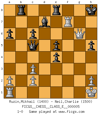 Last move : 1-0 2006 July 14 19:23:55 [Event "FICGS__CHESS__CLASS_E__000005"] [Site "FICGS"] [Date "2006.05.31"] [Round "1"] [White "Ruzin,Mikhail"] [Black "Neil,Charlie"] [Result "1-0"] [WhiteElo "1400"] [BlackElo "1500"] 1.Nf3 c5 2.e4 Nc6 3.d4 cxd4 4.Nxd4 e6 5.Nc3 a6 6.Be3 Qc7 7.Be2 Bb4 8.Qd2 Nf6 9.f3 O-O 10.g4 d5 11.g5 Nh5 12.f4 Bxc3 13.bxc3 g6 14.Bxh5 gxh5 15.O-O e5 16.Nxc6 bxc6 17.f5 dxe4 18.Bc5 Re8 19.Qe2 Qa5 20.Qe3 Bd7 21.Kh1 Rab8 22.g6 hxg6 23.fxg6 fxg6 24.Qh6 Qxc5 25.Qxg6+ Kh8 26.Rf7 1-0 Reti Opening Kingside Castling by player Black (move 9) Kingside Castling by player White (move 15) Player White won this chess game. Follow this game move after move (download)I am the best player in the world and I am here to prove it. (Bobby Fischer) Schach ist ein Kampf gegen den Fehler. (Johannes Herrman Zukertort) Un juego de Ajedrez es un dialogo, una conversación entre un jugador y su oponente. Cada movimiento del oponente puede contener amenazas o tropiezos, pero un jugador no se puede defender de las amenazas o tomar ventaja de los tropiezos si es que no se pregunta a sí mismo: ¿Que es lo que mi oponente va a hacer después de cada movida?. (Bruce A. Moon) Avant la finale, les dieux ont créé le milieu de partie. (Tarrasch) The only thing that overcomes hard luck is hard work. (Harry Golden)