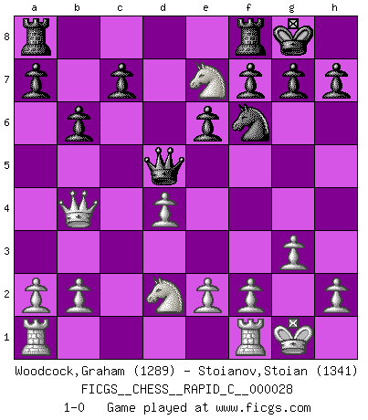 Last move : 1-0 2007 May 24 9:26:32 [Event "FICGS__CHESS__RAPID_C__000028"] [Site "FICGS"] [Date "2007.04.04"] [Round "1"] [White "Woodcock,Graham"] [Black "Stoianov,Stoian"] [Result "1-0"] [WhiteElo "1289"] [BlackElo "1341"] 1.d4 d5 2.c4 dxc4 3.Qa4+ Bd7 4.Qxc4 e6 5.Nf3 Nf6 6.g3 Nc6 7.Bg2 Bb4+ 8.Bd2 Bxd2+ 9.Nbxd2 O-O 10.O-O Na5 11.Qb4 b6 12.Ne5 Nc6 13.Bxc6 Bxc6 14.Nxc6 Qd5 15.Ne7+ 1-0 Queen's gambit accepted Kingside Castling by player Black (move 9) Kingside Castling by player White (move 10) Player White won this chess game. Follow this game move after move (download)Look at Garry Kasparov. After he loses, invariably he wins the next game. He just kills the next guy. That's something that we have to learn to be able to do. (Maurice Ashley) Wenn Du absolut nicht mehr weißt, was Du tun sollst, dann ist es Zeit für Panik. (John van der Wiel) Diferente gente reacciona diferentemente en aceptar la derrota. (Bobby Fischer) Des combinaisons [dans le jeu d'échecs] pareilles à des mélodies. Je crois entendre pour ainsi dire la musique des coups... (Vladimir Nabokov) The various flowers seem good to different people. (Chinese proverb)