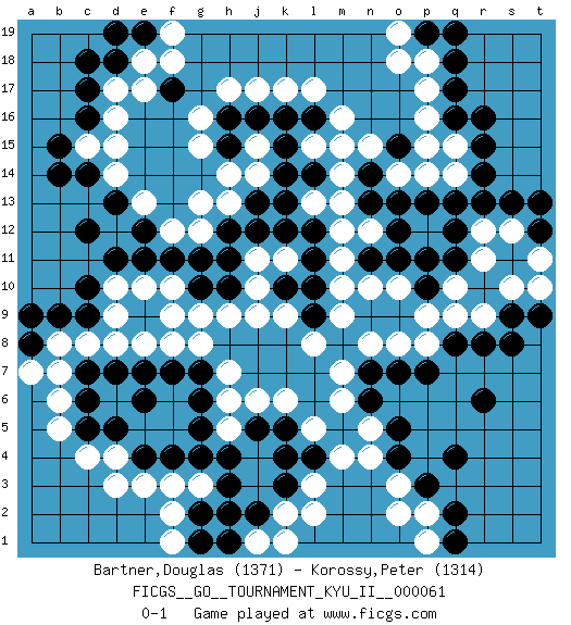 Last move : 0-1 2017 May 19 23:11:5 [Event "FICGS__GO__TOURNAMENT_KYU_II__000061"] [Site "FICGS"] [Date "2017.02.18"] [Round "1"] [Black "Bartner,Douglas"] [White "Korossy,Peter"] [Result "0-1"] [Rating 1 "1371"] [Rating 2 "1314"] 1.r16 d16 2.q4 d4 3.f17 h17 4.c17 d17 5.c16 d15 6.d18 e18 7.c18 e17 8.c14 d14 9.b14 p17 10.r13 m16 11.c6 c8 12.e6 f3 13.c10 d9 14.d11 f9 15.f11 c4 16.g6 h9 17.g4 g3 18.h4 d6 19.d7 b6 20.c7 b7 21.d5 o3 22.r6 l3 23.j16 j17 24.k16 h14 25.k14 m14 26.h16 k17 27.j13 h13 28.j12 g16 29.h11 q15 30.r15 q14 31.q13 q10 32.r8 p8 33.q2 k9 34.c5 b5 35.q18 p18 36.q17 p16 37.l16 l17 38.b9 b8 39.h3 l5 40.o5 n4 41.o4 n5 42.p3 o2 43.o7 n8 44.p7 o8 45.o13 n12 46.n13 m13 47.o15 p14 48.p13 o14 49.n14 n15 50.p19 o19 51.q19 o18 52.e19 f19 53.d19 f18 54.e4 e3 55.f4 j6 56.d13 g12 57.g11 e13 58.e12 f12 59.h12 g13 60.h2 f2 61.n7 m7 62.p11 h7 63.l11 m10 64.l10 m9 65.l9 l8 66.h15 g15 67.k4 k2 68.k5 k6 69.l4 m4 70.k3 l2 71.n6 m6 72.q8 q9 73.p10 p9 74.n11 m11 75.o12 m12 76.q11 s10 77.s9 r11 78.g7 g8 79.f7 s12 80.s13 r9 81.s8 t11 82.r14 n10 83.o11 j10 84.l12 l15 85.k15 k11 86.k12 j14 87.l14 m15 88.q16 p15 89.c9 e10 90.e11 l13 91.k13 c15 92.b15 h5 93.g5 r12 94.j5 h6 95.j2 d10 96.c12 o10 97.g2 f1 98.g1 d3 99.k10 j11 100.h10 j9 101.q12 e8 102.e7 p2 103.q1 p1 104.t13 d8 105.a8 a7 106.a9 j1 107.t9 t10 108.h1 k1 109.g10 g9 110.t12 f10 111.pass f8 112.pass j15 113.pass pass 0-1 Here are the names of the openings (joseki) played in the four corners : Corner d16 : d16 f17 Hoshi (Hwajeom, Seongjeom, Xingwei`) 4-4 Point. The star or hoshi (4-4) point, emphasizing influence at the potential expense of territory. Ikken Kakari (Hankan Keolch'im, Yi Gua`jiao~, 1-Space Low Approach). Black 2 is the standard approach move to the 4-4. Corner q16 : r16 p17 Komoku (Somok, Xiao~mu`) 3-4 Point. The komoku (3-4) point is the traditional corner enclosure move.. Ikken Kakari (Hankan Keolch'im, Yi Gua`jiao~, 1-Space Low Pincer). The small knight move is the basic approach move to the 3-4 point stone. It has been continually used for over four centuries. There are limitless variations, with new moves constantly being discovered. White 2 opens the door to a treaure store of joseki. Corner d4 : d4 c6 Hoshi (Hwajeom, Seongjeom, Xingwei`) 4-4 Point. The star or hoshi (4-4) point, emphasizing influence at the potential expense of territory. Ikken Kakari (Hankan Keolch'im, Yi Gua`jiao~, 1-Space Low Approach). Black 2 is the standard approach move to the 4-4. Corner q4 : q4 o3 Hoshi (Hwajeom, Seongjeom, Xingwei`) 4-4 Point. The star or hoshi (4-4) point, emphasizing influence at the potential expense of territory. Ikken Kakari (Hankan Keolch'im, Yi Gua`jiao~, 1-Space Low Approach). White 2 is the standard approach move to the 4-4. Player White won this Go (weiqi, baduk) game. Follow this game move after move (download)While the Baroque rules of chess could only have been created by humans, the rules of go are so elegant, organic, and rigorously logical that if intelligent life forms exist elsewhere in the universe, they almost certainly play go. (Edward Lasker, international chess master) Don't be discouraged. It's often the last key in the bunch that opens the lock. (Author unknown)