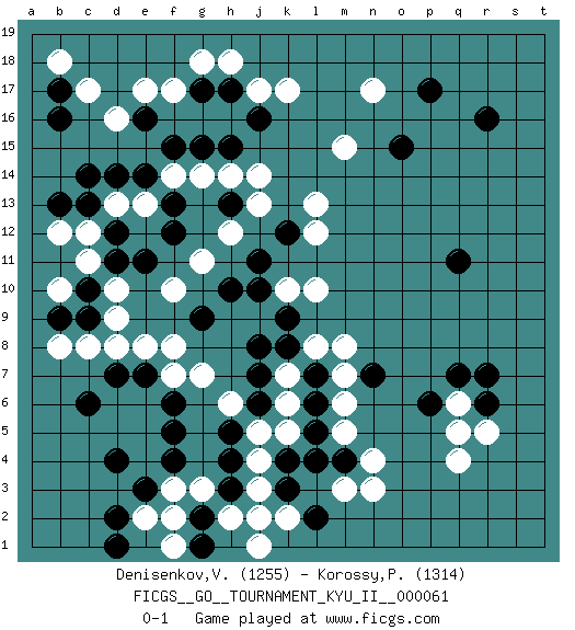 Last move : 0-1 2017 April 17 20:31:8 [Event "FICGS__GO__TOURNAMENT_KYU_II__000061"] [Site "FICGS"] [Date "2017.02.18"] [Round "1"] [Black "Denisenkov,Valentin"] [White "Korossy,Peter"] [Result "0-1"] [Rating 1 "1255"] [Rating 2 "1314"] 1.r16 d16 2.d4 q4 3.r6 q6 4.q7 r5 5.p6 q5 6.r7 n3 7.c14 c12 8.e14 f17 9.b16 c17 10.b17 b18 11.b13 b12 12.g15 c8 13.c6 f3 14.d2 j3 15.p17 j17 16.q11 n17 17.o15 m15 18.n7 k10 19.f5 e2 20.e3 f2 21.f4 f7 22.e7 e8 23.d7 d8 24.f6 g7 25.l4 m5 26.l2 j5 27.m4 n4 28.l5 m6 29.l6 m7 30.l7 m8 31.j6 h6 32.h4 j4 33.h5 k6 34.j7 k7 35.k8 k5 36.j8 l8 37.h3 h2 38.j2 k2 39.k3 j1 40.k4 j2 41.g2 g3 42.g1 f1 43.d1 m3 44.f12 g11 45.e11 d13 46.d14 e13 47.f13 f14 48.c10 d10 49.d11 b10 50.b9 c11 51.c9 d9 52.c13 b8 53.d12 g14 54.e16 e17 55.f15 h14 56.h15 j14 57.h17 h18 58.g17 g18 59.j16 k17 60.g9 f8 61.h10 f10 62.j10 h12 63.k9 l10 64.j11 l12 65.k12 l13 66.h13 j13 0-1 Here are the names of the openings (joseki) played in the four corners : Corner q4 : q4 r6 Hoshi (Hwajeom, Seongjeom, Xingwei`) 4-4 Point. The star or hoshi (4-4) point, emphasizing influence at the potential expense of territory. Ikken Kakari (Hankan Keolch'im, Yi Gua`jiao~, 1-Space Low Approach). Black 2 is the standard approach move to the 4-4. Corner d16 : d16 c14 Hoshi (Hwajeom, Seongjeom, Xingwei`) 4-4 Point. The star or hoshi (4-4) point, emphasizing influence at the potential expense of territory. Ikken Kakari (Hankan Keolch'im, Yi Gua`jiao~, 1-Space Low Approach). Black 2 is the standard approach move to the 4-4. Corner d4 : d4 c8 Hoshi (Hwajeom, Seongjeom, Xingwei`) 4-4 Point. The star or hoshi (4-4) point, emphasizing influence at the potential expense of territory. Player White won this Go (weiqi, baduk) game. Follow this game move after move (download)Don't disturb symmetry. (Anonymous) It's not a bug - it's an undocumented feature. (Anonymous)