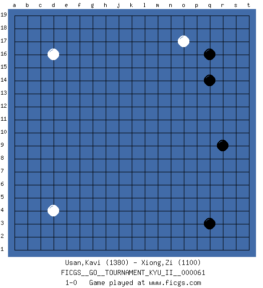 Last move : 1-0 2017 March 23 20:46:23 [Event "FICGS__GO__TOURNAMENT_KYU_II__000061"] [Site "FICGS"] [Date "2017.02.18"] [Round "1"] [Black "Usan,Kavi"] [White "Xiong,Zi"] [Result "1-0"] [Rating 1 "1380"] [Rating 2 "1100"] 1.q16 d4 2.q3 d16 3.r9 o17 4.q14 1-0 This go game has been lost on time (started : 2017.02.18 11:22:37) Here are the names of the openings (joseki) played in the four corners : Corner q16 : q16 o17 Hoshi (Hwajeom, Seongjeom, Xingwei`) 4-4 Point. The star or hoshi (4-4) point, emphasizing influence at the potential expense of territory. Ikken Kakari (Hankan Keolch'im, Yi Gua`jiao~, 1-Space Low Approach). White 2 is the standard approach move to the 4-4. Player Black won this Go (weiqi, baduk) game. Follow this game move after move (download)The comb formation is alive. (Anonymous) Coffee just isn't my cup of tea. (Unknown)