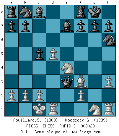 Last move : 0-1 2007 June 9 18:49:44 [Event "FICGS__CHESS__RAPID_C__000028"] [Site "FICGS"] [Date "2007.04.04"] [Round "1"] [White "Rouillard,Stephane"] [Black "Woodcock,Graham"] [Result "0-1"] [WhiteElo "1300"] [BlackElo "1289"] 1.e4 c5 2.d4 e6 3.d5 exd5 4.exd5 Qe7+ 5.Be2 Qe4 6.Nc3 Qxg2 7.Bf3 Qg6 8.Qe2+ Be7 9.Bf4 d6 10.Bxd6 Qxd6 11.O-O-O Nh6 12.h3 O-O 13.Ne4 Qf4+ 14.Qe3 Qxe3+ 0-1 This chess game has been lost on time (started : 2007.04.04 1:2:25) Sicilian : Smith-Morra gambit Queenside Castling by player White (move 11) Kingside Castling by player Black (move 12) Player Black won this chess game. Follow this game move after move (download)Chess is life. (Bobby Fischer) Ich suche im Schach immer etwas Eigenes. Riskantes Spiel im Stile schachlicher Musketiere ist nicht meine Sache, auch wenn es vielen Freunden scharfer Wendungen gefällt. (Anatoly Karpov) ¿Que sería del Ajedrez sin errores graciosos?. (Kurt Richter) Fischer est le meilleur joueur du monde et Karpov n'est qu'un joueur de bistrot. (Garry Kasparov, agé de 16 ans) Heh, heh, heh. Time to abandon ship. (General Grievous in Star Wars ep.3)