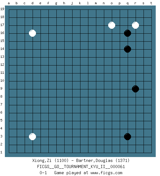 Last move : 0-1 2017 March 25 20:47:51 [Event "FICGS__GO__TOURNAMENT_KYU_II__000061"] [Site "FICGS"] [Date "2017.02.18"] [Round "1"] [Black "Xiong,Zi"] [White "Bartner,Douglas"] [Result "0-1"] [Rating 1 "1100"] [Rating 2 "1371"] 1.q16 d16 2.q3 d3 3.r9 o17 4.q14 r17 0-1 This go game has been lost on time (started : 2017.02.18 11:22:37) Here are the names of the openings (joseki) played in the four corners : Corner q16 : q16 o17 Hoshi (Hwajeom, Seongjeom, Xingwei`) 4-4 Point. The star or hoshi (4-4) point, emphasizing influence at the potential expense of territory. Ikken Kakari (Hankan Keolch'im, Yi Gua`jiao~, 1-Space Low Approach). White 2 is the standard approach move to the 4-4. Player White won this Go (weiqi, baduk) game. Follow this game move after move (download)Sacrifice for shape. (Anonymous) God, you are such an idiot. - Actually, I thought I was more of a jerk. (Gregory House to Stacy Warner, House M.D.)