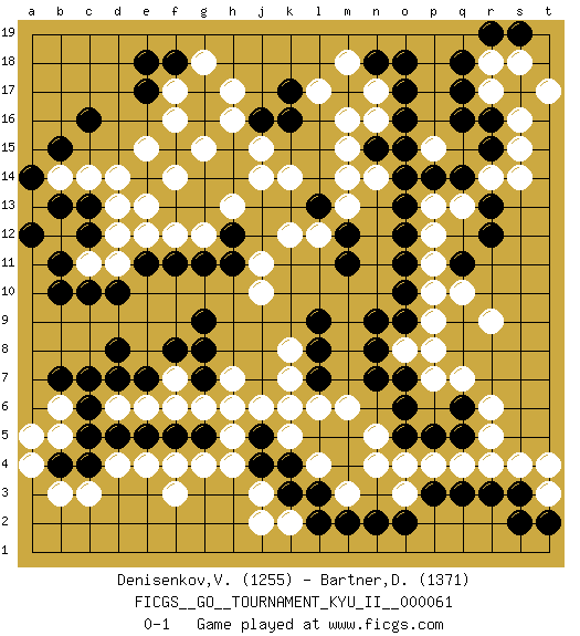 Last move : 0-1 2017 March 12 11:6:25 [Event "FICGS__GO__TOURNAMENT_KYU_II__000061 "] [Site "FICGS"] [Date "2017.02.18"] [Round "1"] [Black "Denisenkov,Valentin "] [White "Bartner,Douglas "] [Result "0-1"] [Rating 1 "1255"] [Rating 2 "1371"] 1.q16 r4 2.c16 d4 3.c6 f3 4.b4 c3 5.d10 f16 6.p3 n4 7.p5 r6 8.r3 q4 9.q3 p4 10.n2 d14 11.e17 e15 12.k16 r14 13.o17 s16 14.q11 r9 15.r12 p9 16.p14 q13 17.o11 p13 18.o13 p12 19.o12 p11 20.l3 k14 21.h15 f17 22.f18 g18 23.e18 h17 24.k17 b14 25.b15 j15 26.j16 h16 27.h14 k12 28.h12 p15 29.o15 j11 30.h11 j10 31.g9 c11 32.c10 d11 33.e11 e12 34.f11 n14 35.o14 m13 36.m11 m16 37.m17 n16 38.o16 n17 39.n18 m18 40.o18 l17 41.n9 o8 42.n8 e6 43.o7 p7 44.o6 o3 45.o2 j3 46.r15 s15 47.r13 q10 48.q14 s14 49.r16 j6 50.g7 g6 51.l7 f7 52.d8 b3 53.b11 b12 54.b10 r17 55.q17 r18 56.q18 b5 57.c5 b6 58.c4 a4 59.b7 a5 60.f8 h7 61.g8 k2 62.l2 d6 63.c7 s4 64.s3 t3 65.t2 t4 66.s2 j14 67.k3 j2 68.j4 h4 69.j5 h5 70.c13 d13 71.c12 d12 72.b13 c14 73.a12 g15 74.g14 f14 75.f13 e13 76.a14 k6 77.l5 f12 78.g13 g12 79.g11 h13 80.o5 o4 81.m4 k5 82.k4 l6 83.m5 m6 84.n7 n5 85.e7 f6 86.d5 e4 87.e5 m3 88.m2 l4 89.f5 f4 90.g5 g4 91.d7 h6 92.l13 l12 93.m12 m14 94.n15 m15 95.o9 p8 96.q5 r5 97.q6 q7 98.r19 s18 99.s19 t17 100.l9 k8 101.l8 k7 102.o10 p10 0-1 Here are the names of the openings (joseki) played in the four corners : Corner d4 : d4 c6Hoshi (Hwajeom, Seongjeom, Xingwei`) 4-4 Point. The star or hoshi (4-4) point, emphasizing influence at the potential expense of territory.Ikken Kakari (Hankan Keolch'im, Yi Gua`jiao~, 1-Space Low Approach). Black 2 is the standard approach move to the 4-4. Corner d16 : c16 f16Komoku (Somok, Xiao~mu`) 3-4 Point. The komoku (3-4) point is the traditional corner enclosure move..Niken Takagakari (Dukan Nop'dakeolch'im, E`r Gaojia, 2-Space High Approch). The great master Honinbo Shuei (1852-1906) favored the two-space high (niken taka-gakari) approach, especially in two stone handicap games. This approach move was very popular in the 1910s. Wu Qingyuan = Go Seigen frequently played this way, considering it a good "whole board" approach. In recent years, O Rissei has often used the two-space high approach. Corner q4 : r4 p3Komoku (Somok, Xiao~mu`) 3-4 Point. The komoku (3-4) point is the traditional corner enclosure move..Ikken Kakari (Hankan Keolch'im, Yi Gua`jiao~, 1-Space Low Pincer). The small knight move is the basic approach move to the 3-4 point stone. It has been continually used for over four centuries. There are limitless variations, with new moves constantly being discovered. Black 2 opens the door to a treaure store of joseki. Corner q16 : q16 r14Hoshi (Hwajeom, Seongjeom, Xingwei`) 4-4 Point. The star or hoshi (4-4) point, emphasizing influence at the potential expense of territory.Ikken Kakari (Hankan Keolch'im, Yi Gua`jiao~, 1-Space Low Approach). White 2 is the standard approach move to the 4-4. Player White won this Go (weiqi, baduk) game.Follow this game move after move (download ) One point in the center is worth ten in the corner. (Anonymous) Patience, use the Force, think ! (Obi-Wan Kenobi in Star Wars ep.2)