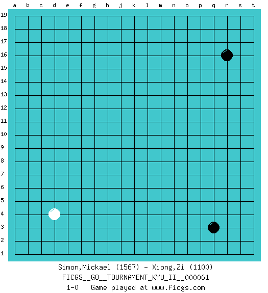 Last move : 1-0 2017 March 23 20:46:23 [Event "FICGS__GO__TOURNAMENT_KYU_II__000061"] [Site "FICGS"] [Date "2017.02.18"] [Round "1"] [Black "Simon,Mickael"] [White "Xiong,Zi"] [Result "1-0"] [Rating 1 "1567"] [Rating 2 "1100"] 1.r16 d4 2.q3 1-0 This go game has been lost on time (started : 2017.02.18 11:22:37) Here are the names of the openings (joseki) played in the four corners : Corner q4 : q3 1-0 Komoku (Somok, Xiao~mu`) 3-4 Point. The komoku (3-4) point is the traditional corner enclosure move.. Player Black won this Go (weiqi, baduk) game. Follow this game move after move (download)If there is no stone on the handicap point, the carpenter's square is dead. (Anonymous) Kids, you tried your best and you failed miserably. The lesson is, never try. (Simpsons)
