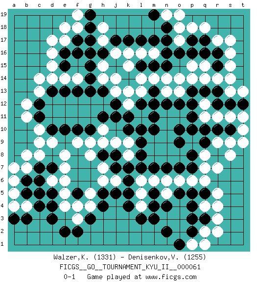 Last move : 0-1 2017 April 4 18:52:47 [Event "FICGS__GO__TOURNAMENT_KYU_II__000061"] [Site "FICGS"] [Date "2017.02.18"] [Round "1"] [Black "Walzer,Karel"] [White "Denisenkov,Valentin"] [Result "0-1"] [Rating 1 "1331"] [Rating 2 "1255"] 1.d3 d16 2.q16 r4 3.p4 q6 4.q3 r3 5.m3 r14 6.r12 p14 7.o16 q11 8.q13 q14 9.p13 o13 10.p12 s16 11.o12 o14 12.q9 q12 13.r13 r11 14.o10 s9 15.r8 s8 16.h4 c9 17.c7 c13 18.f16 e17 19.f17 f18 20.g18 e18 21.h16 r17 22.l17 p18 23.n18 o17 24.n16 e8 25.e13 e14 26.f13 f14 27.g13 e6 28.d5 h7 29.d13 d14 30.c12 c14 31.d10 d9 32.e10 c10 33.k10 l14 34.n17 m12 35.m10 b12 36.c11 b11 37.k7 r7 38.o7 o6 39.p7 p6 40.m5 m6 41.m7 n5 42.n4 l5 43.m4 l6 44.l7 k12 45.j12 j13 46.j11 k16 47.k17 j16 48.j17 h15 49.g15 h14 50.g14 f4 51.g3 f3 52.k4 g9 53.g10 f9 54.f10 h10 55.h11 h9 56.h13 j14 57.n12 n13 58.e2 p9 59.p10 q8 60.p8 q7 61.o9 r9 62.q10 q2 63.p2 q4 64.p3 s13 65.s12 s14 66.r10 s11 67.s10 t10 68.f2 d6 69.c6 b8 70.f5 e5 71.d4 g5 72.p17 o18 73.q17 q18 74.r16 s17 75.t12 t11 76.p11 t9 77.m11 l11 78.l10 g4 79.h5 h6 80.k5 k9 81.l9 k8 82.l8 a5 83.b3 a7 84.b5 a4 85.a3 b7 86.b6 a6 87.m15 l16 88.m13 m14 89.l12 k13 90.k11 h17 91.g16 h18 92.g19 f19 93.g17 m16 94.n15 n14 95.l15 k15 96.m17 p15 97.p16 l13 98.m12 n19 99.m19 o19 100.n7 n6 101.j8 j9 102.j7 j6 103.h8 g8 104.k6 b4 105.c4 c8 106.d7 e7 107.e16 d17 108.p5 r2 109.q5 r5 110.r15 s15 111.e15 l4 112.l3 p1 113.o1 q1 114.n2 t13 115.j5 e4 116.o5 d15 117.c5 q15 0-1 Here are the names of the openings (joseki) played in the four corners : Corner q4 : r4 p4 Komoku (Somok, Xiao~mu`) 3-4 Point. The komoku (3-4) point is the traditional corner enclosure move.. Ikken Takagakari (Hankan Nop'dakeolch'im, Yi Gaogua`jiao~, 1-Space High Approach). The 5-4 approach move has become more popular in modern times, as modern Go emphasizes speed and influence. Corner q16 : q16 r14 Hoshi (Hwajeom, Seongjeom, Xingwei`) 4-4 Point. The star or hoshi (4-4) point, emphasizing influence at the potential expense of territory. Ikken Kakari (Hankan Keolch'im, Yi Gua`jiao~, 1-Space Low Approach). White 2 is the standard approach move to the 4-4. Player White won this Go (weiqi, baduk) game. Follow this game move after move (download)Don't reduce your own liberties. (Bill Taylor) Life is painting a picture, not doing a sum. (Oliver Wendell Holmes, Jr.)