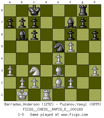 Last move : 1-0 2017 April 27 13:3:24 [Event "FICGS__CHESS__RAPID_E__000183"] [Site "FICGS"] [Date "2017.02.18"] [Round "1"] [White "Barradas,Anderson"] [Black "Puzanov,Vasyl"] [Result "1-0"] [WhiteElo "1292"] [BlackElo "0899"] 1.e4 e5 2.Nf3 Nc6 3.d4 exd4 4.Nxd4 Bc5 5.Nxc6 Qf6 6.Qf3 dxc6 7.Bd3 Be6 8.h3 O-O-O 9.Nc3 h6 10.Be3 Bb6 11.a3 Qxf3 12.gxf3 Nf6 13.O-O-O Nd7 14.f4 f6 15.f5 Bf7 16.Rhg1 Rhg8 17.Kb1 Ne5 18.Be2 Rxd1+ 19.Rxd1 1-0 This chess game has been lost on time (started : 2017.02.18 16:23:6) Scotch game Queenside Castling by player Black (move 8) Queenside Castling by player White (move 13) Player White won this chess game. Follow this game move after move (download)By playing at Chess then, we may learn: First: Foresight... Second: Circumspection... Third: Caution... And lastly, we learn by Chess the habit of not being discouraged by present bad appearances in the state of our affairs, the habit of hoping for a favorable chance, and that of persevering in the secrets of resources. (Benjamin Franklin) Moralische Siege zählen nicht. (Savielly Grigorievitsch Tartakower) Del Ajedrez se ha dicho que la vida no es lo suficientemente larga para él, pero eso es culpa de la vida, no del Ajedrez. (William Ewart Napier) Nous vivons dans un monde échiquéen : chaque jour qui passe est un défi à relever. (Philosophe Sasha) Wisdom begins at the end. (Daniel Webster)